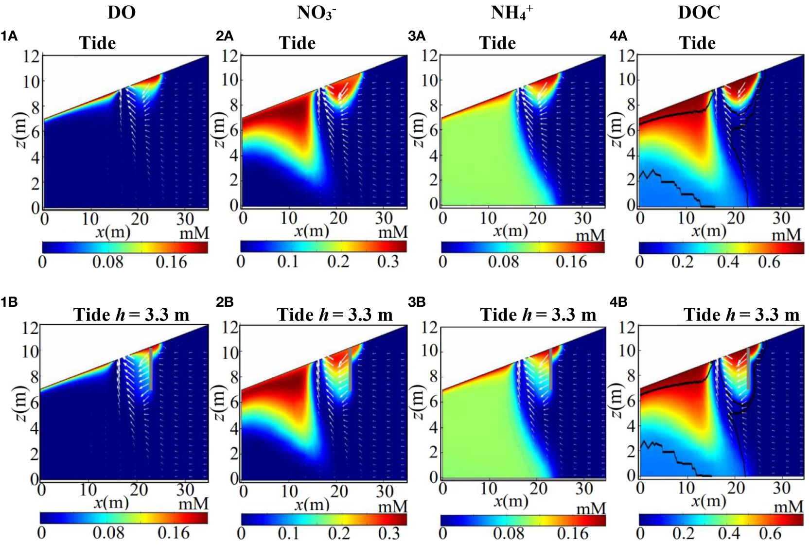 Saltwater transports a large quantity of dissolved oxygen (DO), NO3-, ammonium ion (NH4+), and dissolved organic carbon (DOC) into the aquifer. Several chemical reactions such as DOC degradation, aerobic respiration, nitrification (NH4+ transformation to NO3-), and denitrification (NO3- transformation to N2) can take place (Meile et al., 2009; Sun et al., 2019). These processes are affected by tidal force, which can change the recycling rate and chemical composition of saltwater (Rocha, 2013; Zheng et al., 2020; Gao et al., 2022). Shuai et al. (2017) established a 2-D estuarine subsurface flow model based on the numerical model, assuming that DO, NO3-, NH4+, and DOC primarily originate from rivers. Nitrification occurs in the shallow layers, while denitrification occurs in the deeper anaerobic layers. These reactions, which are both controlled by redox conditions and DOC concentrations, play an important role in determining NO3- in the aquifer. Preferential flow can affect nitrification and denitrification reactions by directly or indirectly changing soil properties (Pan et al., 2022). These reactions are also influenced by the redox conditions, aeration, and particle composition of the solution (Xin et al., 2009). Xiao et al. (2019) conducted field observations and flow modeling to assess how crab burrows drive carbon exchange in an intertidal marsh in South Carolina. They found that the concentrations of dissolved inorganic and organic carbon in crab burrow pore water differ from that in the surrounding soil matrix, and the gas-phase concentrations of CO2 in crab burrows were approximately six times greater than that in ambient air. These results suggested that crab burrows increase the reaction of carbon. Heiss (2020) evaluated the effect of deep whale burial on NO3- removal efficiencies in aquifers and found that organic carbon sources affected NO3- removal since DOC not only provided the reactant for denitrification but also provided an anaerobic environment (DOC oxidation). Cheng et al. (2020) investigated the effect of preferential flows on nitrification and denitrification in aquifers, and the results showed that preferential flows promoted sediment nitrification, and the degree of promotion was significant with the increase of density. Li et al. (2021) conducted laboratory experiments and found that crab burrows significantly affected the concentrations of NH4+ and NO3- and significantly promoted the nitrogen exchange flux at the sediment–water interface. It can be seen that the preferential flow not only effectively changes the pore water flow and solute transport rate but also increases the oxygen content of the aquifer and the contact area between the sediment and O2, thus interfering with the reaction of NO3-.