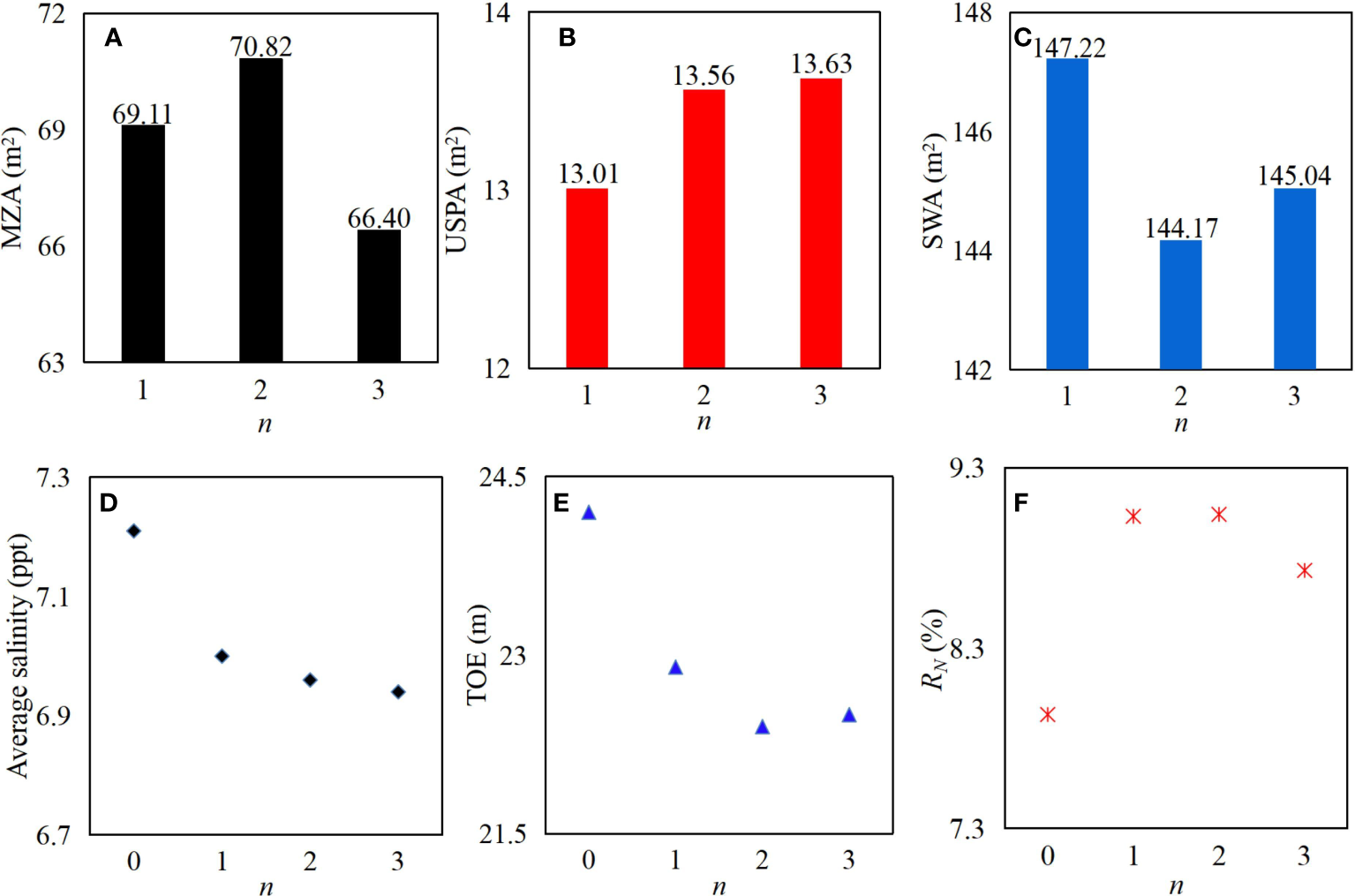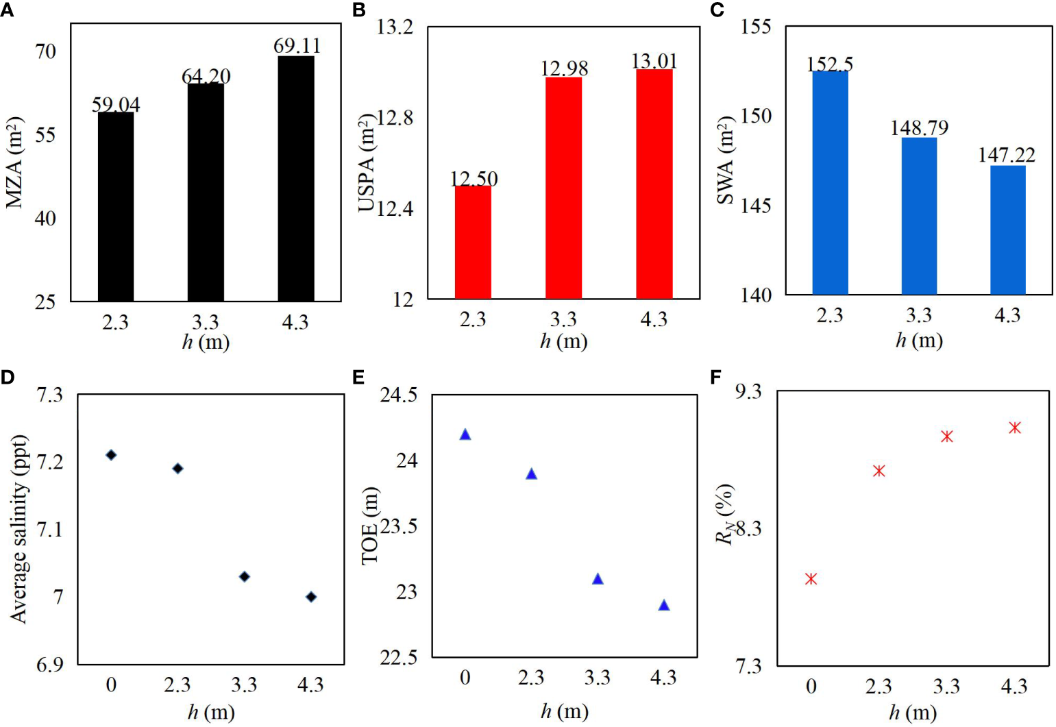 The salinity distribution under two different conditions is presented in Figure 3. Preferential flow modified the salinity distribution under tidal influence. The average salinity (average value of the whole aquifer) in the aquifer decreased from 7.21 to 7.03 ppt, while the TOE decreased from 24.2 to 23.09 m. Under the tidal condition (Figure 3), the area of the mixing zone (MZA) (the area between 10% and 90% salinity contour) was 53.87 m2, the area of USP (USPA) was 10.37 m2, and the area of SW (SWA) was 156.0 m2. However, under the preferential flow, the mixing zone and USP were increased, and SW was decreased, i.e., the MZA is 64.20 m2, the USPA is 12.98 m2, and the SWA is 148.79 m2. This indicated that the preferential flow enhanced freshwater–saltwater mixing and USP (Figure 3E); the preferential flow weakened the length of SW in the aquifer and reduced the salinity.