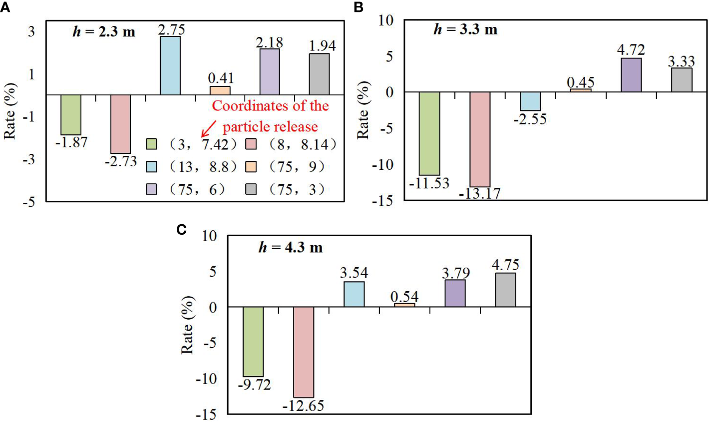 The simulation first conducted a no-preferential flow model under the tidal action. Subsequently, to investigate the influence of depth and quantity of preferential flow, we set different depths (2.3, 3.3, and 4.3 m) and quantities (from 1 to 3) of preferential flow conditions under the tide action (five groups of experiments were conducted). The specific parameters are listed in Table 2.
