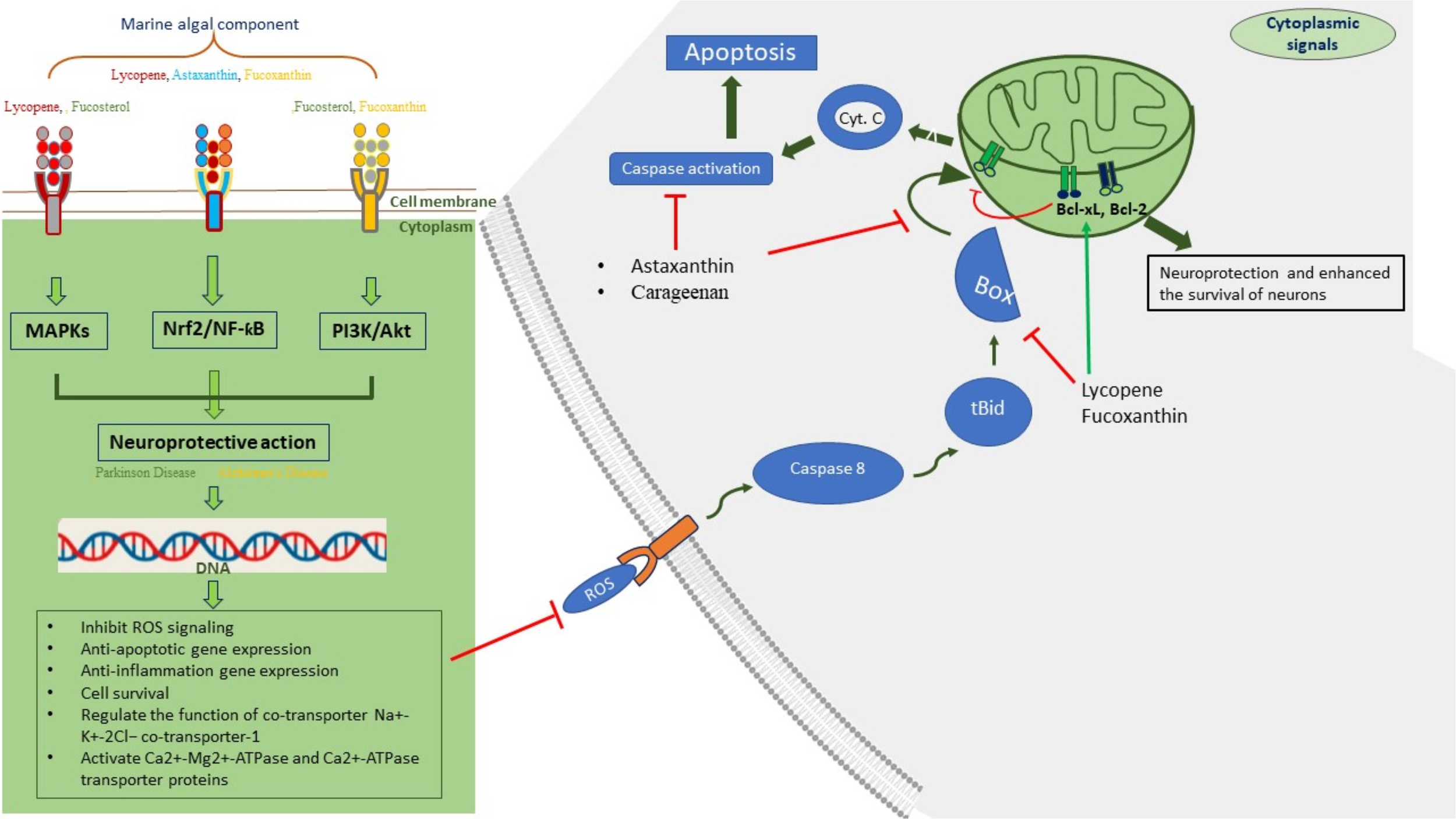 Currently, marine algae play an important role in the field of neuroprotection via various mechanisms, such as anti-neuroinflammatory and antioxidant effects, the inhibition of neuron death, and cholinesterase inhibitors. Therefore, various therapeutic systems, such as nutraceuticals and pharmaceuticals, are believed to have neuroprotective effects on marine algae (Pradhan et al., 2020). Signaling and neuroprotective functions of various components of marine algae are shown in Figure 3. In the biological system, ROS affect human health by damaging macromolecules (Angelova et al., 2018), whereas different lines of experimental evidence have shown that ROS are neutralized by the antioxidant components of various marine algae, such as green, brown, and red algal species, which have lots of beneficial compounds, such as vitamins, carotenoids, astaxanthin, phycocyanin, phycobilin, and polyphenols. These components of marine algae are used to treat different diseases, such as cancer, diabetes, immune responses, and neurological diseases (Pradhan et al., 2020). Different signaling pathways that regulate the survival of brain neurons, like ROS, NF-kB/Akt, and MAPK pathways, balance neurodegeneration, and we will further talk about the regulation of these signaling pathways in terms of metabolites of marine algae. Lycopene is a red–pink carotenoid found in several fruits and vegetables, like guava and watermelon. Lycopene significantly recovers neuronal life by regulating the cyclooxygenase-2 (COX-2) pathway in inflammation, balancing Nrf2 via the NF-κB pathway and stimulating MAPK in the brain (Fradet et al., 2009; Hwang et al., 2017; Zhao et al., 2017). To prevent primary hippocampal neuron apoptosis, lycopene stopped the degradation of the antiapoptotic proteins Bcl-2 and Bcl-xL, enhanced the efflux of calcium from neurons by activating Ca2+-Mg2+-ATPase and Ca2+-ATPase transporter proteins (Zhang F. et al., 2017), and balanced mitochondrial membrane integrity to regulate membrane potential (Qu et al., 2016). During ROS challenge in brain neurons, lycopene also balances the inner membrane potential of mitochondria to increase the life of neurons (Soleymaninejad et al., 2017). Astaxanthin is lipophilic in nature; thus, trans-astaxanthin easily crosses the blood–brain barrier and plays a significant role not only in neuroprotection in the cortex and hippocampus of rats (Manabe et al., 2018) but also in neurological disorders via different pathways: it initially reduces the levels of ROS-generating enzymes, for example, p22phox protein and NADPH oxidase 4; it increases the level of superoxide dismutase, which has antioxidant effects; and it increases Nrf2 protein levels to reduce oxidative stress (Deng et al., 2019; Lin et al., 2020). Astaxanthin prevents the apoptosis of neurons in the brain of rat via reducing the levels of Bax protein and cleaved caspase 3. Unlike initial parameters, it increases the level of Bcl2 by balancing the mitochondrial membrane potential of hippocampal neurons of rat brain (Wang et al., 2018; Deng et al., 2019). On the other hand, astaxanthin also protected the neurons by balancing the function of the Na+-K+-2Cl− cotransporter-1 (NKCC1) of brain cells regulated by the NF-κB pathway to reduce the swelling of brain cells (Zhang J. et al., 2017). Another highly abundant marine carotenoid, fucoxanthin, is found in edible brown algae (Yang et al., 2021) and has antiapoptotic, antioxidant, and anti-inflammatory properties that protect against neuron damage in animals challenged by neurodegenerative diseases and improve motor function. Various studies have indicated that, like astaxanthin, fucoxanthin enhances rodent brain functions by stimulating Nrf2 transcription factors via different pathways including PI3K/Akt pathways that enhance the expression of target molecules, such as superoxide dismutase, heme oxygenase-1, and Bcl-2, to reduce neural damage or apoptosis (Zhang L. et al., 2017). Another significant neuroprotective role of fucoxanthin in Addison’s disease is that it helps reduce neuroinflammation and oxidative stress and regulate amyloid-β to prevent the aggregation of amyloid-β fibrils (Lakey-Beitia et al., 2019). Fecosterol is an important marine algae-derived phytosterol that shows different medicinal properties, such as neuroprotective, antioxidant, and anti-inflammatory properties. Various experimental and in silico studies have indicated that it can be used against neurodegenerative disorders to recover life of the neurons by regulating different pathways, such as the PI3K/Akt, MAPK, and neurotrophin pathways and also via transporter proteins, enzymes, and TLR signaling related to neurons (Hannan et al., 2019). Alginate is a linear marine polysaccharide of brown algae that plays a significant role in the development of dopaminergic (DA) neurons from induced human pluripotent stem cells (hiPSCs) in in vitro culture systems for easier treatment of patients with PD. Alginate plays a neurogenerative function through the mechanical properties responsible for proper culture of human and mouse embryonic stem cells (ESCs, i.e., hESCs and mESCs) into the mature neuron lineage to treat neurodegenerative diseases (Gilmozzi et al., 2021). Various other components of marine algae, such as lectins (Doolen et al., 2020) and PUFAs (Kim et al., 2022b), play significant roles in different neurodegenerative diseases and enhance the survival of neurons by increasing the secretion of neurotransmitters in the human and animal brains.
