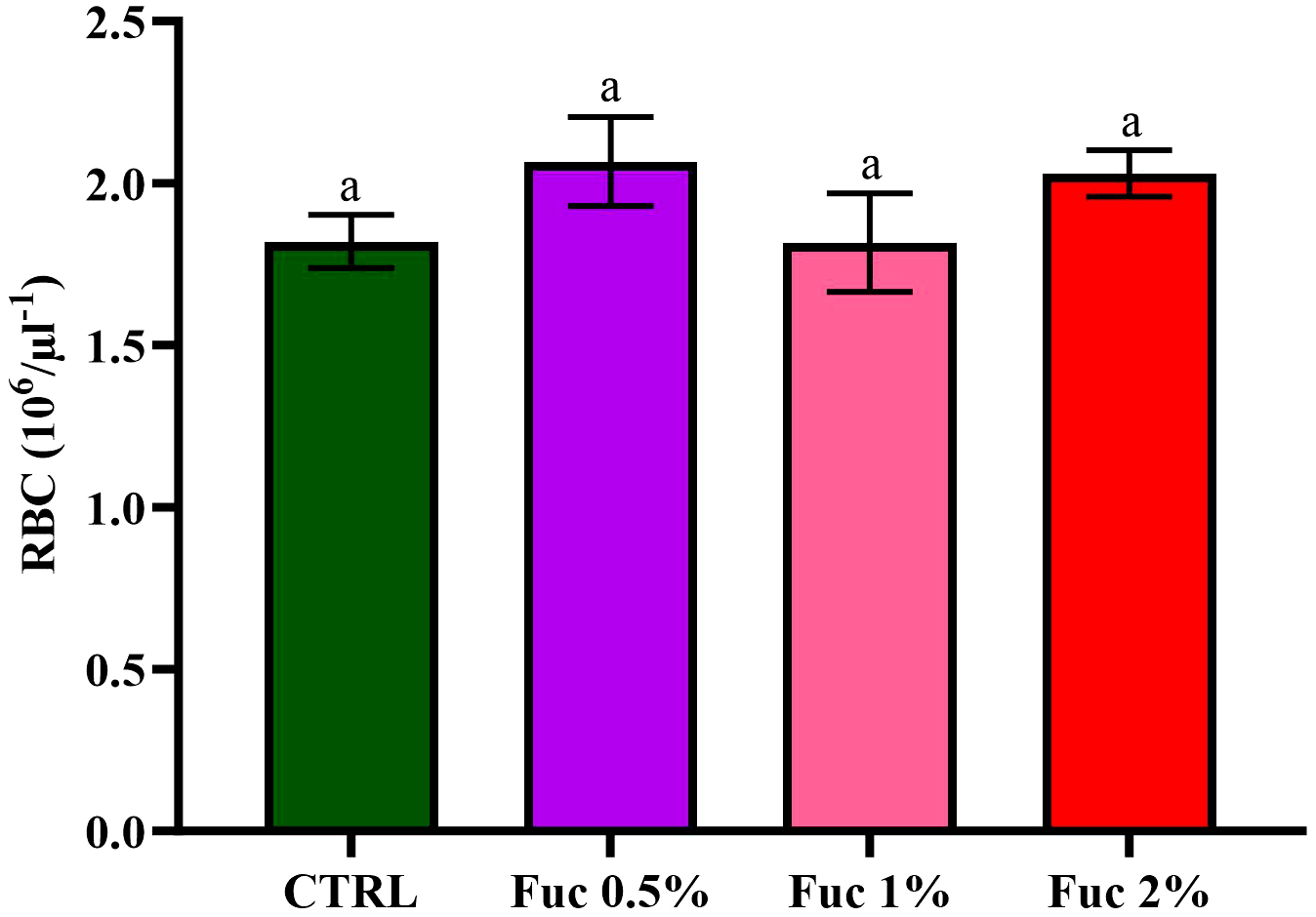 The amount of RBCs in the groups fed with 0.5%, 1%, and 2% Fuc supplements in the Oscar. Values are mean ± SD (n = 9 fish per treatment). Heterogeneous lowercase letters indicate significant differences in different levels of Fuc compared to the control group. Statistical analysis was performed using one-way ANOVA and Tukey’s test to show the difference between the groups. RBC, red blood cell; CTRL, control; Fuc, fucoidan.