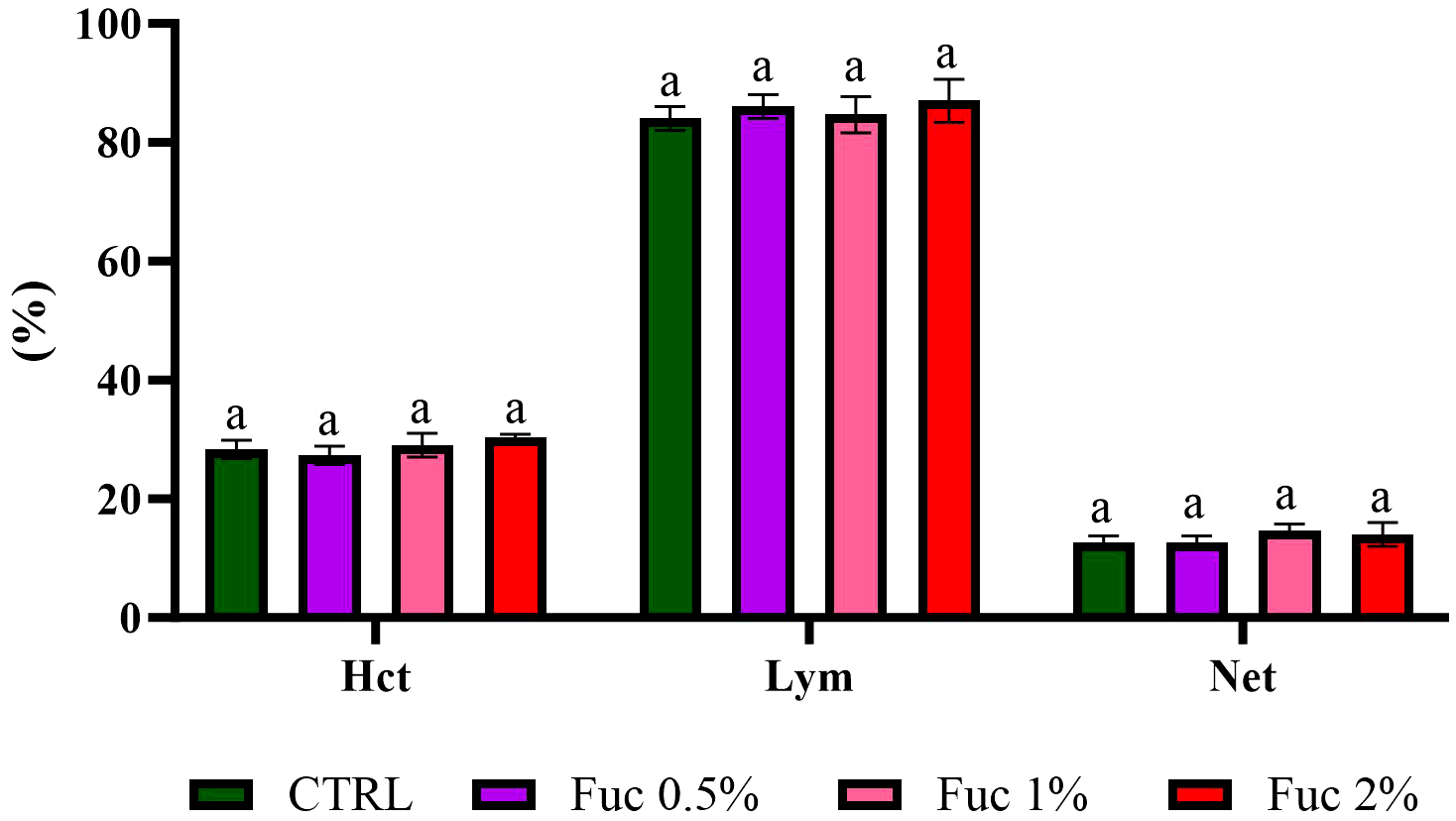 The percentage of Hct, Lym, and Net in the groups fed with 0.5%, 1%, and 2% Fuc supplements in the Oscar. Values are mean ± SD (n = 9 fish per treatment). Heterogeneous lowercase letters indicate significant differences in different levels of Fuc compared to the control group. Statistical analysis was performed using one-way ANOVA and Tukey’s test to show the difference between the groups. Hct, hematocrit; Lym, lymphocyte; Net, neutrophil; CTRL, control; Fuc, fucoidan.