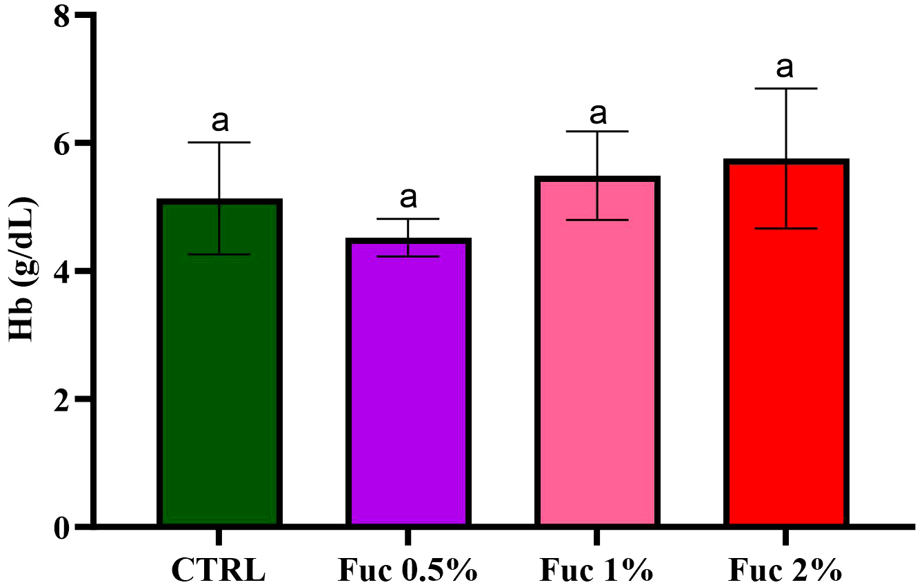 The amount of Hb in the groups fed with 0.5%, 1%, and 2% Fuc supplements in the Oscar. Values are mean ± SD (n = 9 fish per treatment). Heterogeneous lowercase letters indicate significant differences in different levels of Fuc compared to the control group. Statistical analysis was performed using one-way ANOVA and Tukey’s test to show the difference between the groups. Hb, hemoglobin; CTRL, control; Fuc, fucoidan.