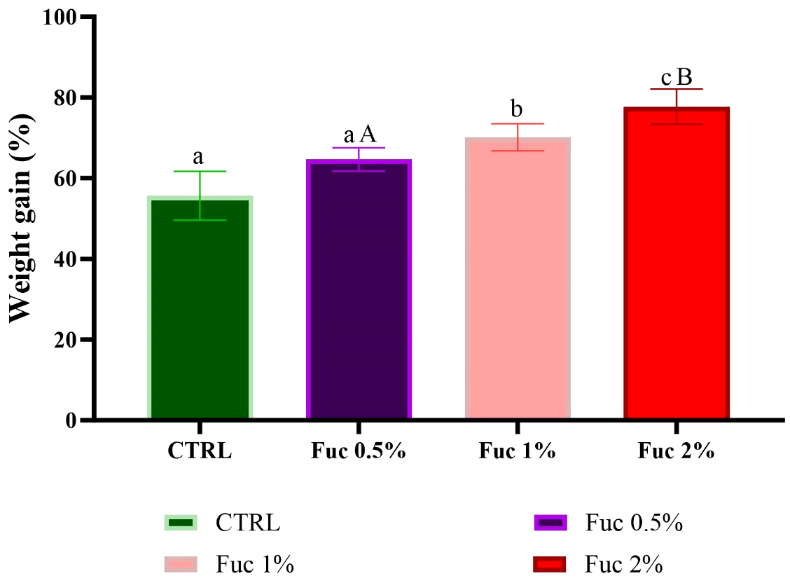 The percentage of WG in the groups fed with 0.5, 1%, and 2% Fuc supplements in the Oscar. Values are mean ± SD (n = 30 fish per treatment). Heterogeneous lowercase letters indicate significant differences in different levels of Fuc compared to the control group. Heterogeneous capital letters indicate significant differences between different Fuc levels. Statistical analysis was performed using one-way ANOVA and Tukey’s test to show the difference between the groups. WG, weight gain; CTRL, control; Fuc, fucoidan; Ns, not significant.