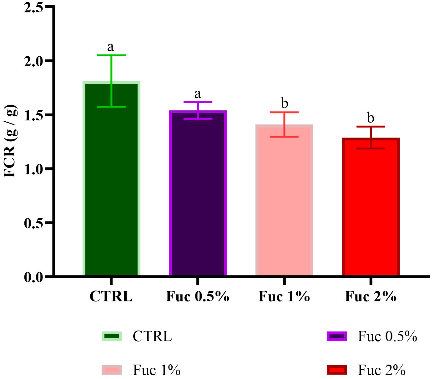 FCR in the groups fed with 0.5%, 1%, and 2% Fuc supplements in the Oscar. Values are mean ± SD (n = 30 fish per treatment). Heterogeneous lowercase letters indicate significant differences in different levels of Fuc compared to the control group. Statistical analysis was performed using one-way ANOVA and Tukey’s test to show the difference between the groups. FCR, feed conversion ratio; CTRL, control; Fuc, fucoidan; Ns, not significant.