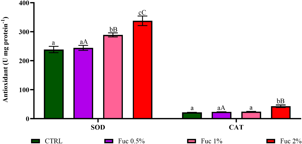 The activity of antioxidant enzymes, including SOD (Fuc 1% and 2%) and CAT (Fuc 2%) increased significantly compared to the control group (Figure 9, p< 0.05). In addition, a significant difference in the activity of SOD was observed between the groups fed with Fuc supplement (Figure 9, p < 0.05). It should be noted that a significant difference between the Fuc 0.5% and Fuc 2% groups was observed (Figure 9, p < 0.05).