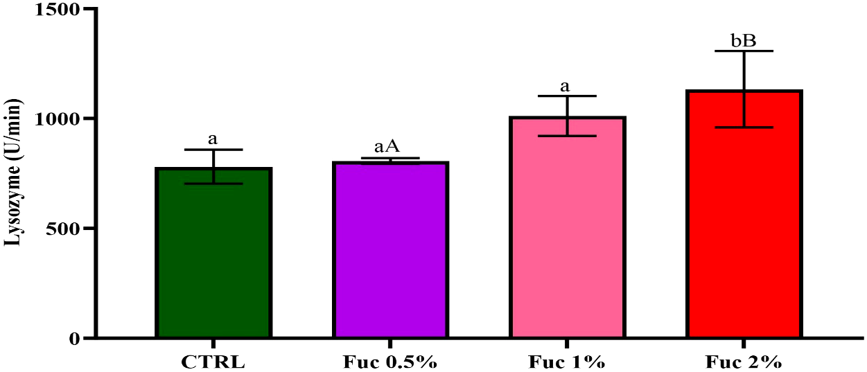 The activity of serum lysozyme in the groups fed with 0.5%, 1%, and 2% Fuc supplements in the Oscar. Values are mean ± SD (n = 9 fish per treatment). Heterogeneous lowercase letters indicate significant differences in different levels of Fuc compared to the control group. Heterogeneous capital letters indicate significant differences between different Fuc levels. Statistical analysis was performed using one-way ANOVA and Tukey’s test to show the difference between the groups. CTRL, control; Fuc, fucoidan.