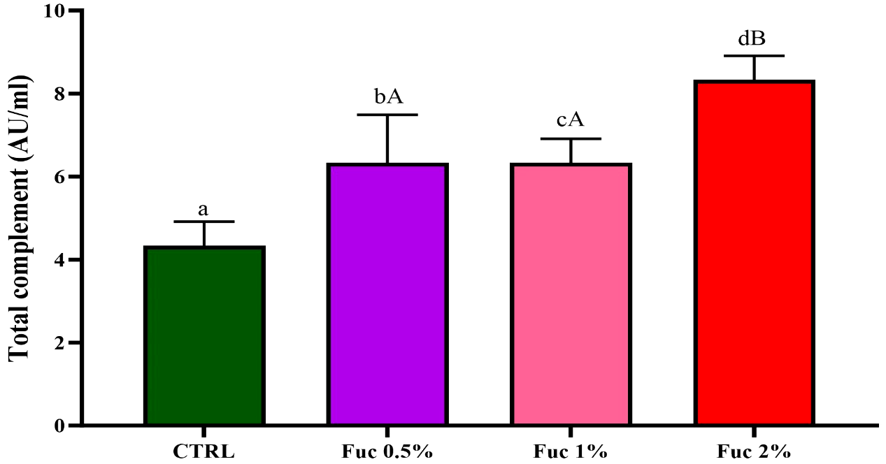 The activity of serum total complement in the groups fed with 0.5%, 1%, and 2% Fuc supplements in the Oscar. Values are mean ± SD (n = 9 fish per treatment). Heterogeneous lowercase letters indicate significant differences in different levels of Fuc compared to the control group. Heterogeneous capital letters indicate significant differences between different Fuc levels. Statistical analysis was performed using one-way ANOVA and Tukey’s test to show the difference between the groups. CTRL, control; Fuc, fucoidan.