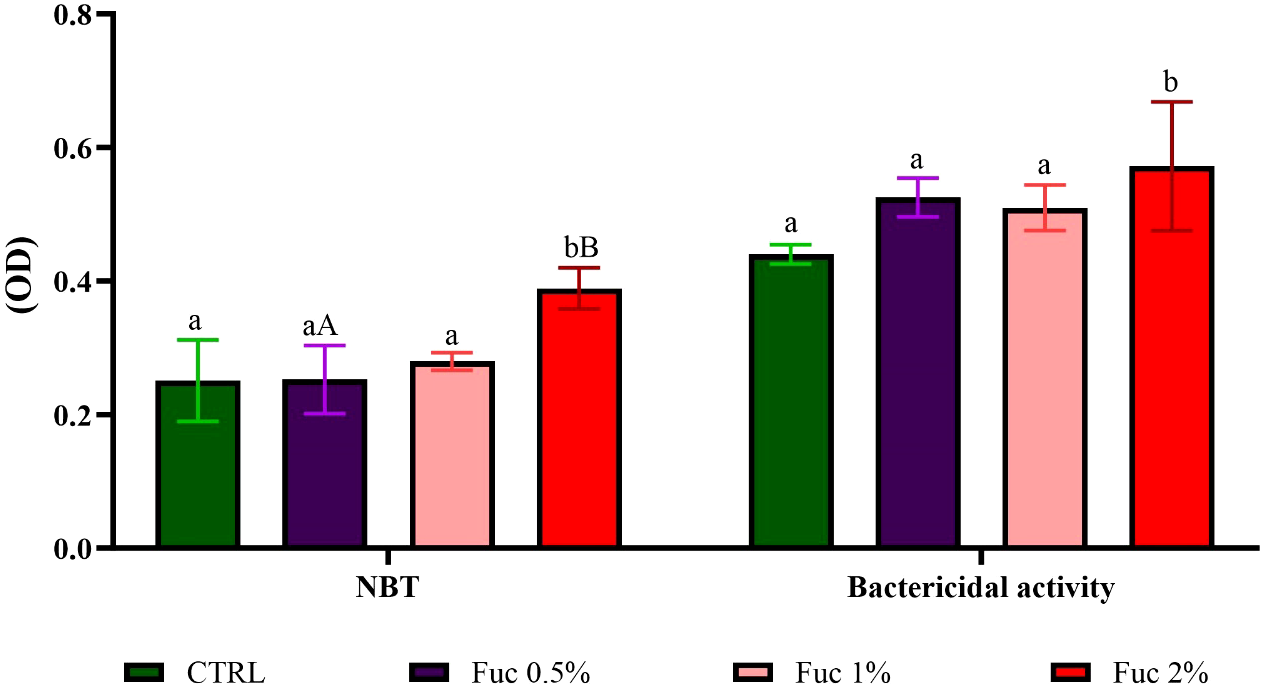 The respiratory burst and bactericidal activity in the groups fed with 0.5%, 1%, and 2% Fuc supplements in the Oscar. Values are mean ± SD (n = 9 fish per treatment). Heterogeneous lowercase letters indicate significant differences in different levels of Fuc compared to the control group. Heterogeneous capital letters indicate significant differences between different Fuc levels. Statistical analysis was performed using one-way ANOVA and Tukey’s test to show the difference between the groups. NBT, nitroblue tetrazolium; CTRL, control; Fuc, fucoidan.