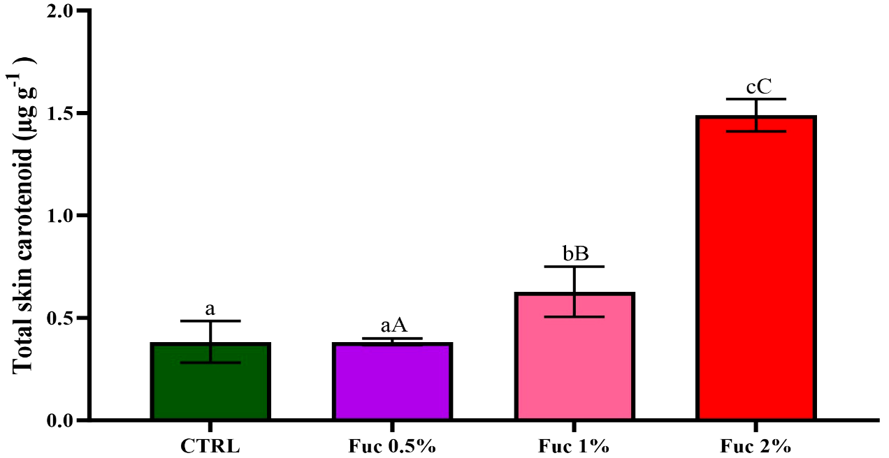After 50 days of feeding with Fuc supplement, the carotenoid content of the whole skin increased significantly in the Fuc 1% and 2% groups compared to the control group (Figure 13, p< 0.05). In addition, a significant difference was observed between the groups (0.5% vs. 1%, 0.5% vs. 2%, and 1% vs. 2%) fed with Fuc supplement.