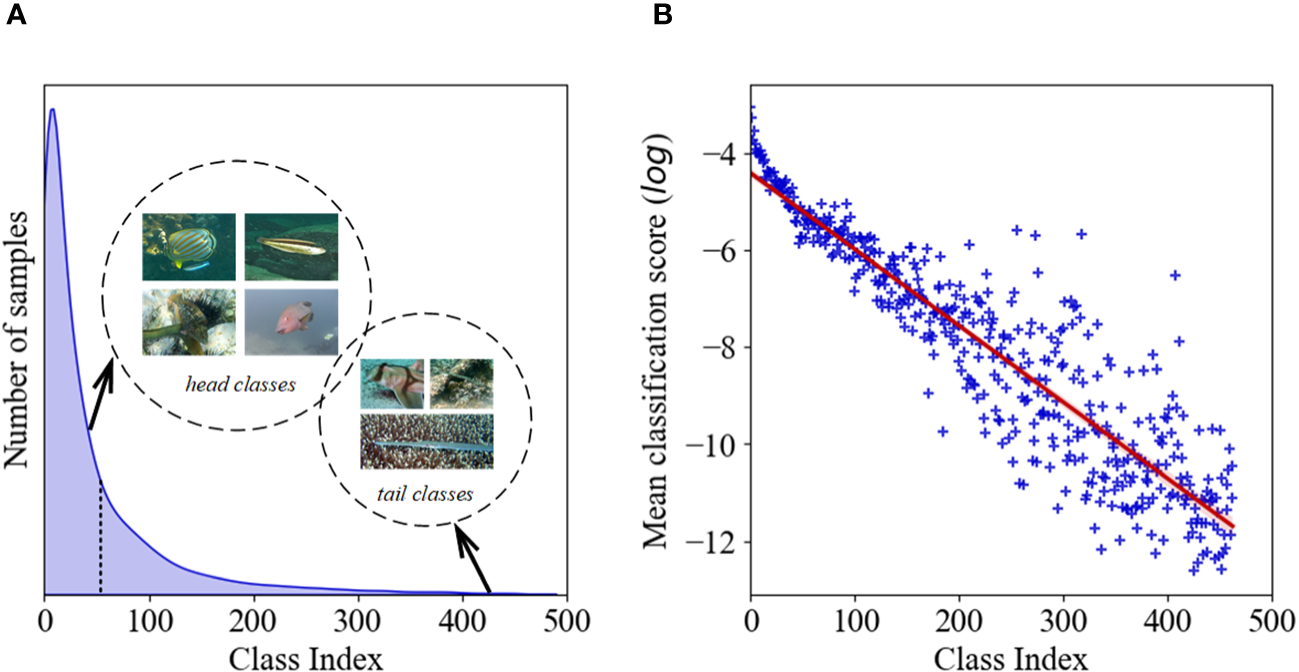 (A) The label distribution of a long-tailed aquatic species dataset (e.g., the FishNet dataset (Khan et al., 2023) with more than 450 classes). (B) Statistics of mean classification score for each class on the FishNet dataset. The x-axis depicts the index corresponding to the corresponding class.