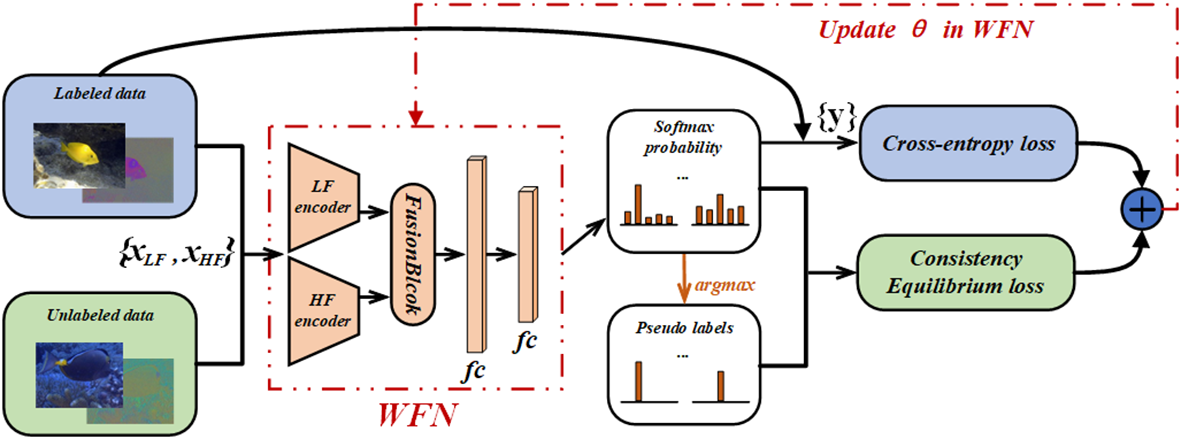Illustration of the overall framework for aquatic species recognition. The proposed WFN (Wavelet Fusion Network) and CEL (Consistency Equilibrium Loss) are added into the exiting SSL scheme FixMatch (Khan et al., 2023).