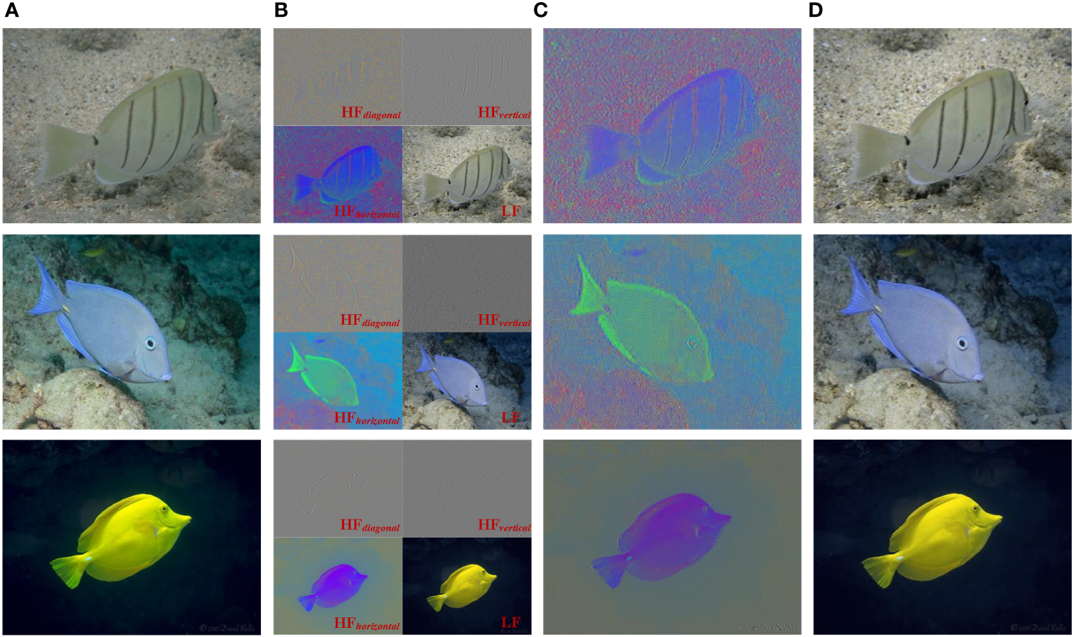 Taking FishNet (Khan et al., 2023) as an example, visualize LF and HF results. (A) Raw image. (B) Wavelet transform results. (C) the HF entity. (D) the LF entity.