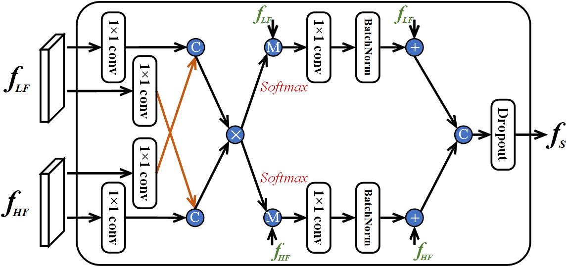 where Ⓜ denotes element-wise multiplication, Bconv1×1(·) represents a sequential operation combining a 1 × 1 convolutional layer and batch normalization. Once obtaining the cross-stream feature representation, we concatenate these features and apply the dropout operator to the fused feature fS. Finally, two fully connected layers are utilized to output the final logits.