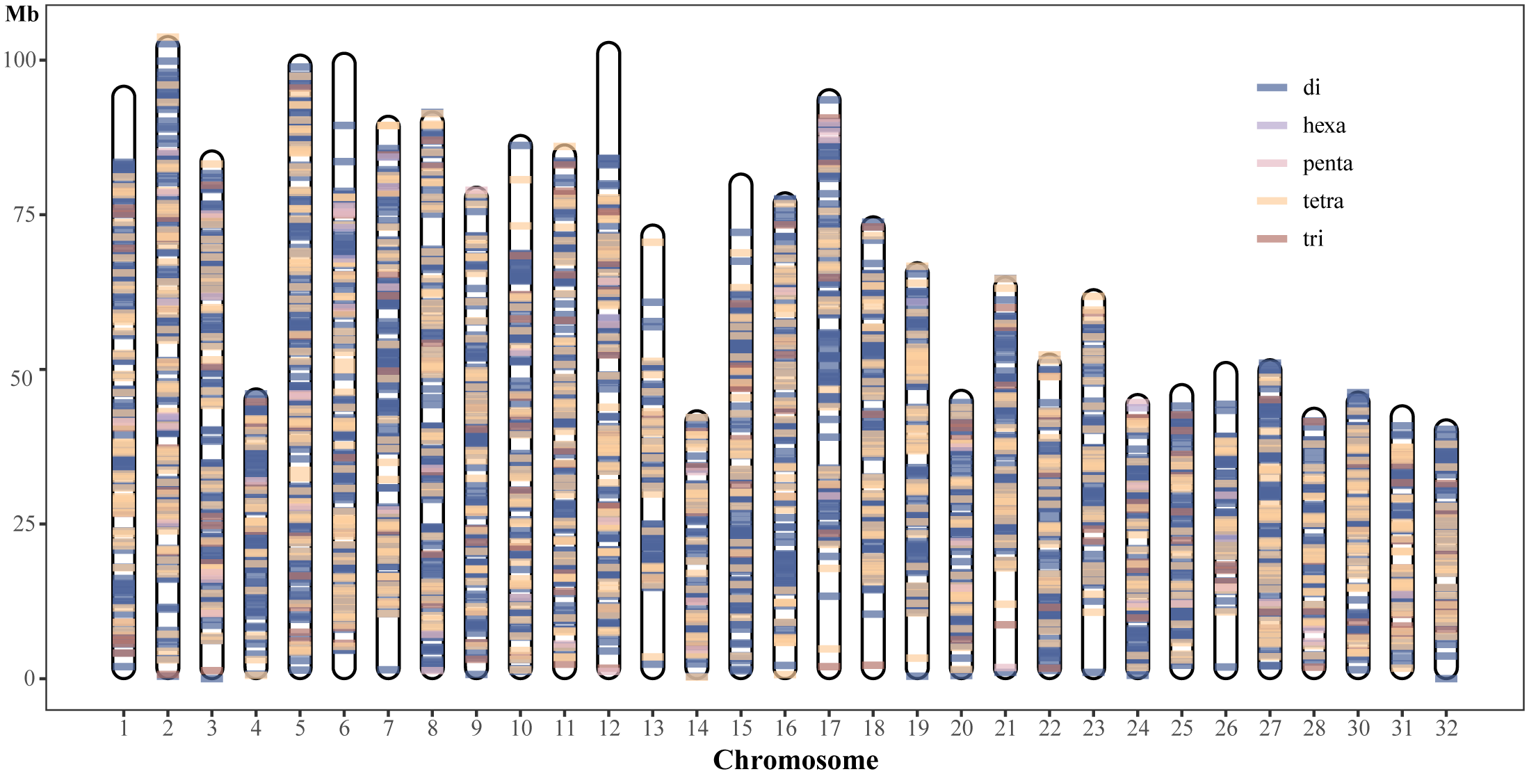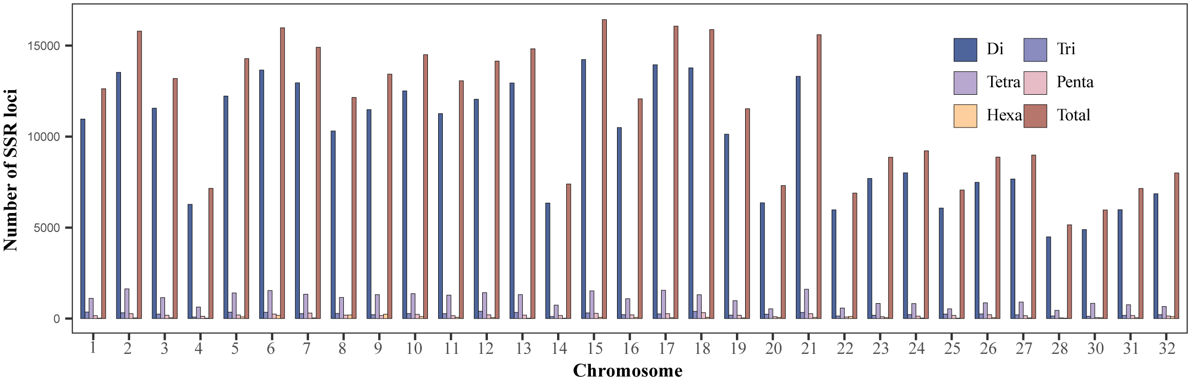 Distribution of di-, tri-, tetra-, penta- and hexanucleotide repeat SSR loci in rainbow trout genome chromosomes.