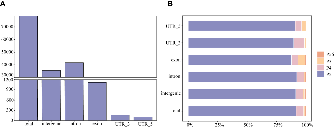 The type and distribution of microsatellites in the genome of rainbow trout. (A) Number of SSRs distributed within and between rainbow trout genomes; (B) Percentage distribution of different types of SSRs within and between rainbow trout genomes. P2, dinucleotide repeats; P3, trinucleotide repeats; P4, tetranucleotide repeats; P56, pentanucleotide repeats and hexanucleotide repeats.
