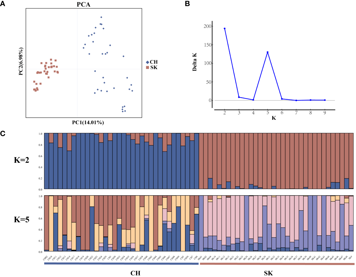 Population structure analyses were performed on 68 rainbow trout samples using the 4,821 highly polymorphic SSR loci screened above. Genetic differences between the two populations were explored by PCA analysis in GenAlEx v. 6.503. Sixty-eight samples were differentiated into two main clusters, CH (red squares) and SK (blue diamonds) in the PCA plot (Figure 4A). Structure software was used to infer the optimal number of subgroups (K) for the 68 rainbow trout samples, K = 2 was selected as the best value, followed by K = 5 (Figure 4B). In addition, the population structure of the 68 samples was shown by Bayesian-based structure analysis (K = 2 and K = 5) (Figure 4C). In the Structure plot with K = 2, two subpopulations of individuals, Q1 and Q2, were labelled in blue and red, respectively. Group Q1 contained exactly 34 individuals from the CH population. Group Q2 also had precisely 34 individuals from the SK population. In the structure plot with K = 5, it remains possible to clearly distinguish the two populations on the basis of the colours of the subpopulation representatives, with the CH population predominantly marked in red, yellow, and blue and the SK population predominantly marked in pink and purple. In summary, population structure analyses of 68 rainbow trout samples using 4,821 highly polymorphic SSR loci yielded consistent results in Structure and PCA, all clearly distinguishing between CH and SK populations (Figures 4A, 4C).