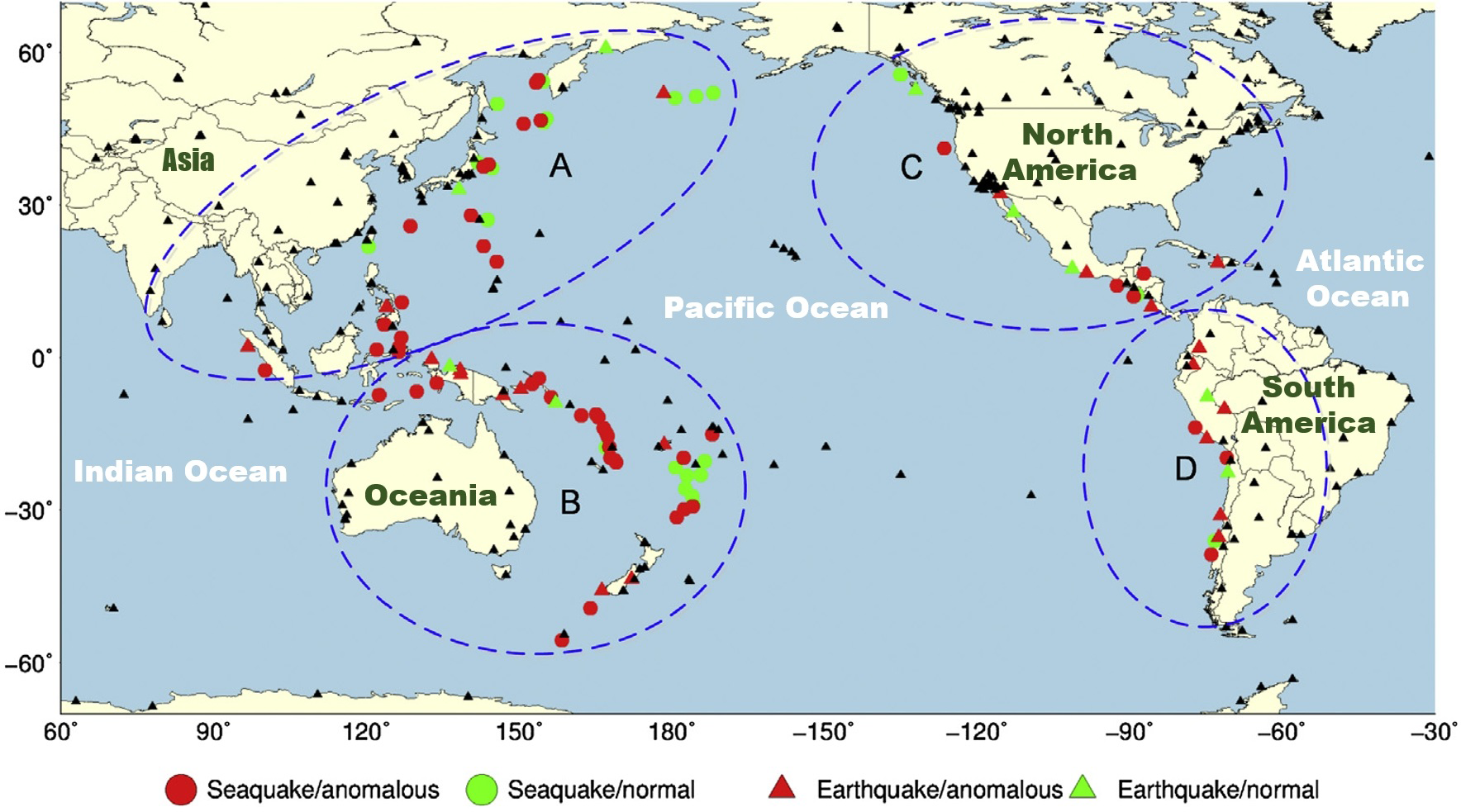 Distribution of 100 M7.0+ earthquakes in the Circum-Pacific seismic belt from 2006 to 2015 (sources from Li et al., 2018, where (A) refers to most parts of Southeast Asia, Taiwan Island, Japan, Kamchatka and the Aleutian Islands; (B) refers to New Guinea, the Solomon Islands, the Fiji Islands and New Zealand; (C) refers to Mexico and the west coast of Canada and America; (D) refers to the west coast of South America; and the black triangles signify the IGS stations).