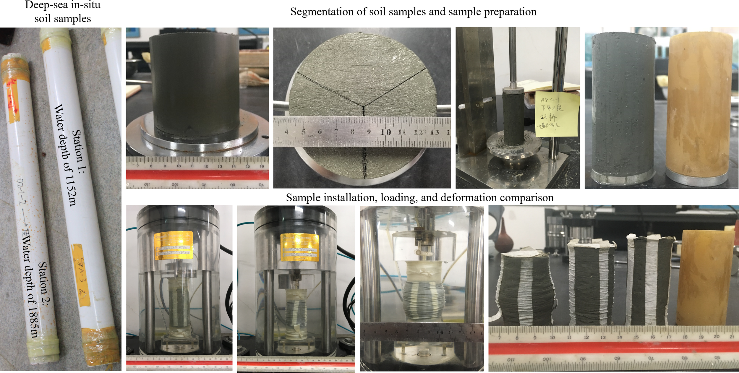 The soil samples used in the test were obtained through the 2016 shared voyage plan for the northeastern South China Sea and the Luzon Strait by using the gravity sampling method. This sampling method can ensure that the sampling depth meets the test requirements and ensure the natural state of undisturbed soil samples to the greatest extent. The soil samples obtained by drilling consisted of shallow sensitive clay located at seabed depths ranging from 0 to 2.4 m, beneath water depths of 1,152 m (Station S7A-3) and 1,885 m (Station D2-1). The soil samples obtained by drilling were canned in polyvinyl chloride (PVC) pipes with a diameter of 10 cm. To facilitate transportation, each section was cut to 1 m. The cut soil samples were marked in turn, wrapped with fresh-keeping film, sealed with adhesive tape, and then sealed at both ends with pipe heads to ensure no loss of water. During the test period, the soil samples were kept in a constant temperature room. The collection, cutting, packaging, transportation, storage and other processes of the above soil samples minimize the disturbance caused by objective factors and effectively ensure the undisturbed nature of the soil samples.