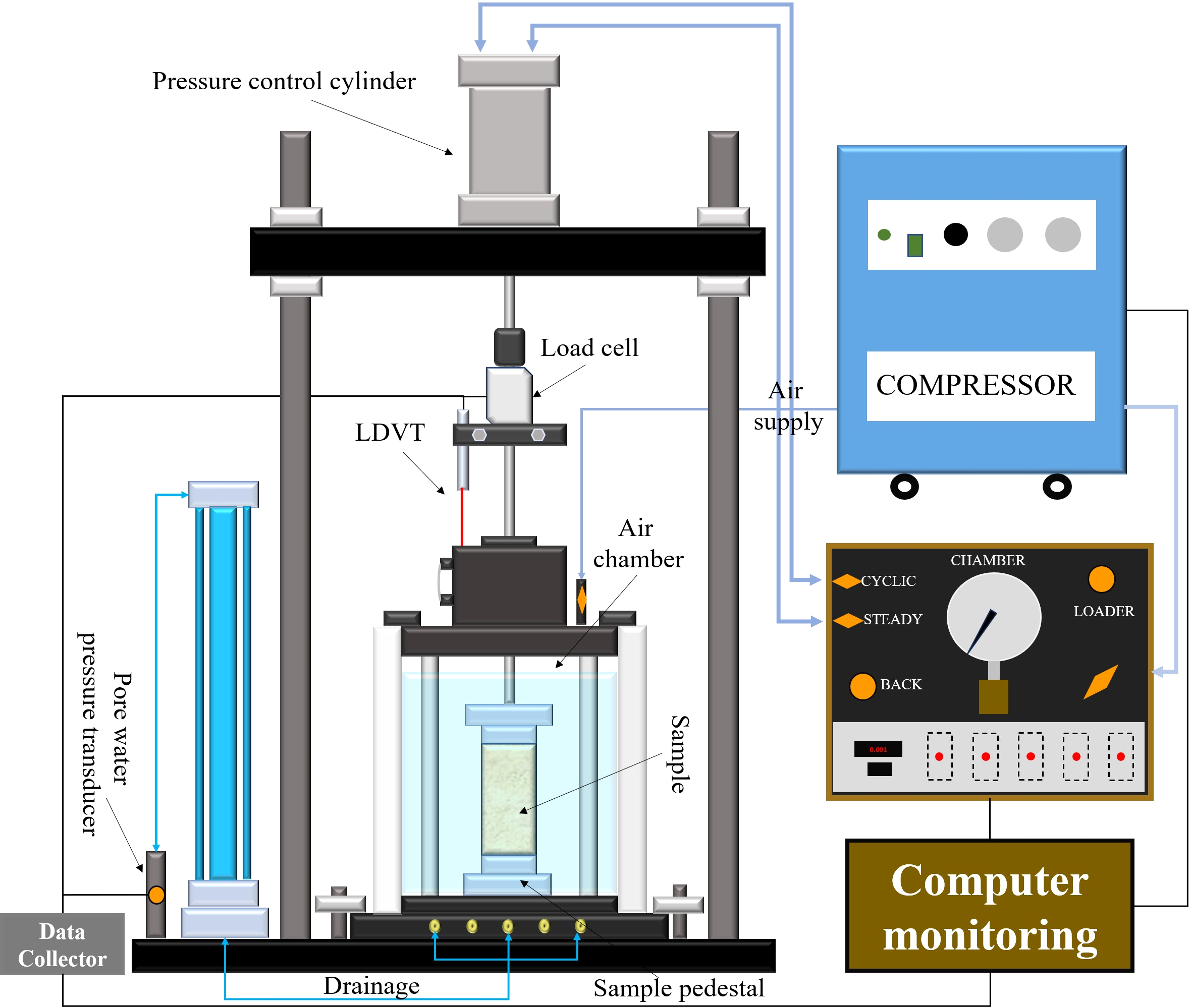In this study, an automated triaxial testing system (ATTS), as shown in Figure 4, was employed to conduct consolidation and cyclic loading triaxial tests. This system, which is specifically designed and manufactured, accommodates the unique requirements of dynamic triaxial testing under both isotropic and anisotropic consolidation conditions. The ATTS applies vertical pressure through a highly precise load cell. This load cell is a crucial component, providing the necessary force to simulate vertical stress conditions on the soil specimens. The confining pressure, an essential parameter in triaxial testing, is generated within the system using an air pressure-type piston. This method of applying confining pressure allows for accurate simulation of the lateral stress conditions that are prevalent in subsurface environments. The axial displacements during the testing process are meticulously recorded using a linear variable differential transformer (LVDT) axial actuator. The LVDT axial actuator offers high-resolution measurements of the specimen’s deformation. The ATTS is also equipped with a pore water pressure transducer positioned at the center of the specimen’s bottom.