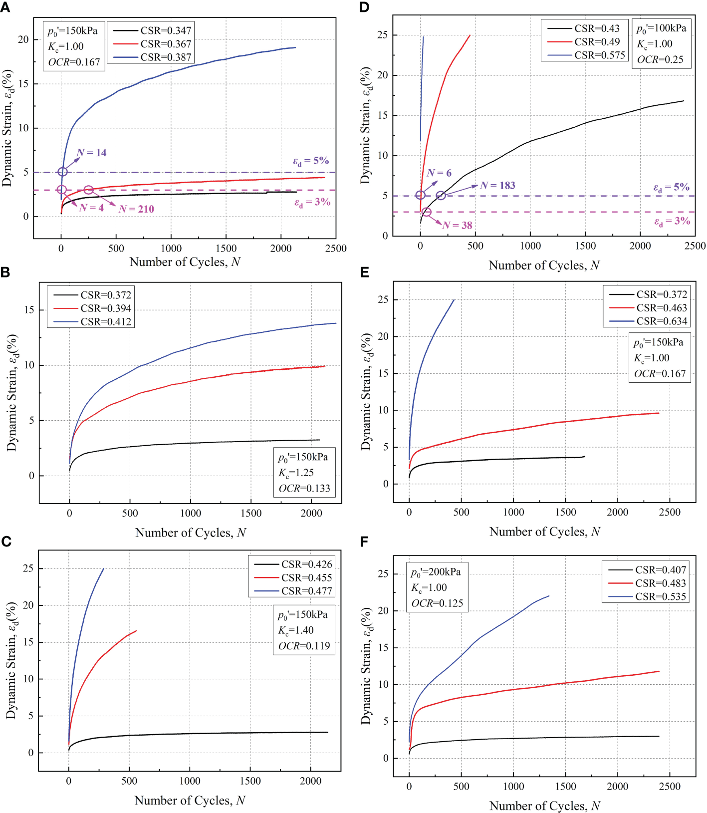 Dynamic strain evolution under different stress magnitudes [(A–C) under different consolidation ratios Kc (Nian et al., 2018); and (D–F) under different overpressure consolidation ratios OCR (Nian et al., 2020)].
