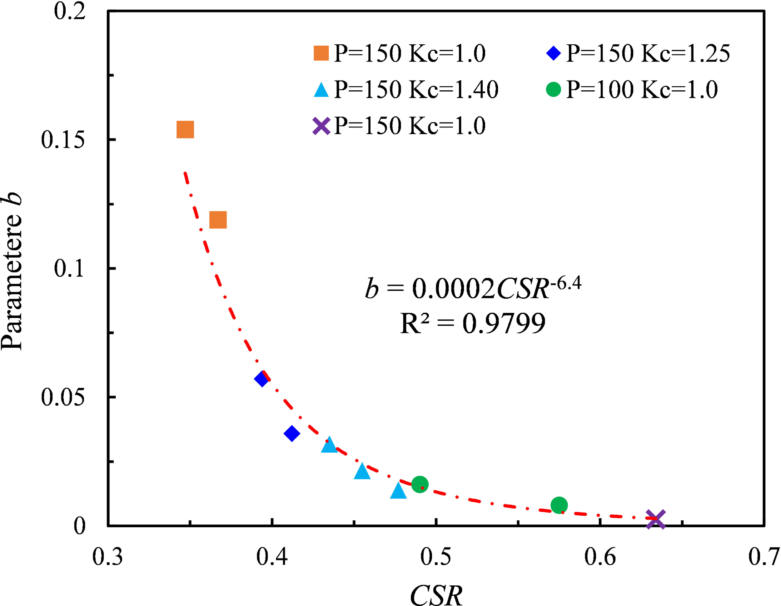 An analysis of the cumulative curve of the corresponding changes shows that parameter a governs the initial strain of the clay, indicating the degree of difficulty for the clay to begin deforming. Additionally, experimental data of ϵd under different CSR values, varying initial mean effective stresses P, and different Kc values were utilized to derive parameters a and b in Equation (2) using the least squares method. The fitting revealed a robust correlation between parameter b and CSR (as illustrated in Figure 7), while parameter a exhibited a strong correlation with CSR and Kc. Their relationships were also determined. The influence of the OCR on the dynamic strain was found to be insignificant, and therefore, it is not reflected in the relationship equation. The correlation of parameters a and b in the fitting formula exceeded 90%, and the corresponding Equations (3) and (4) are as follows: