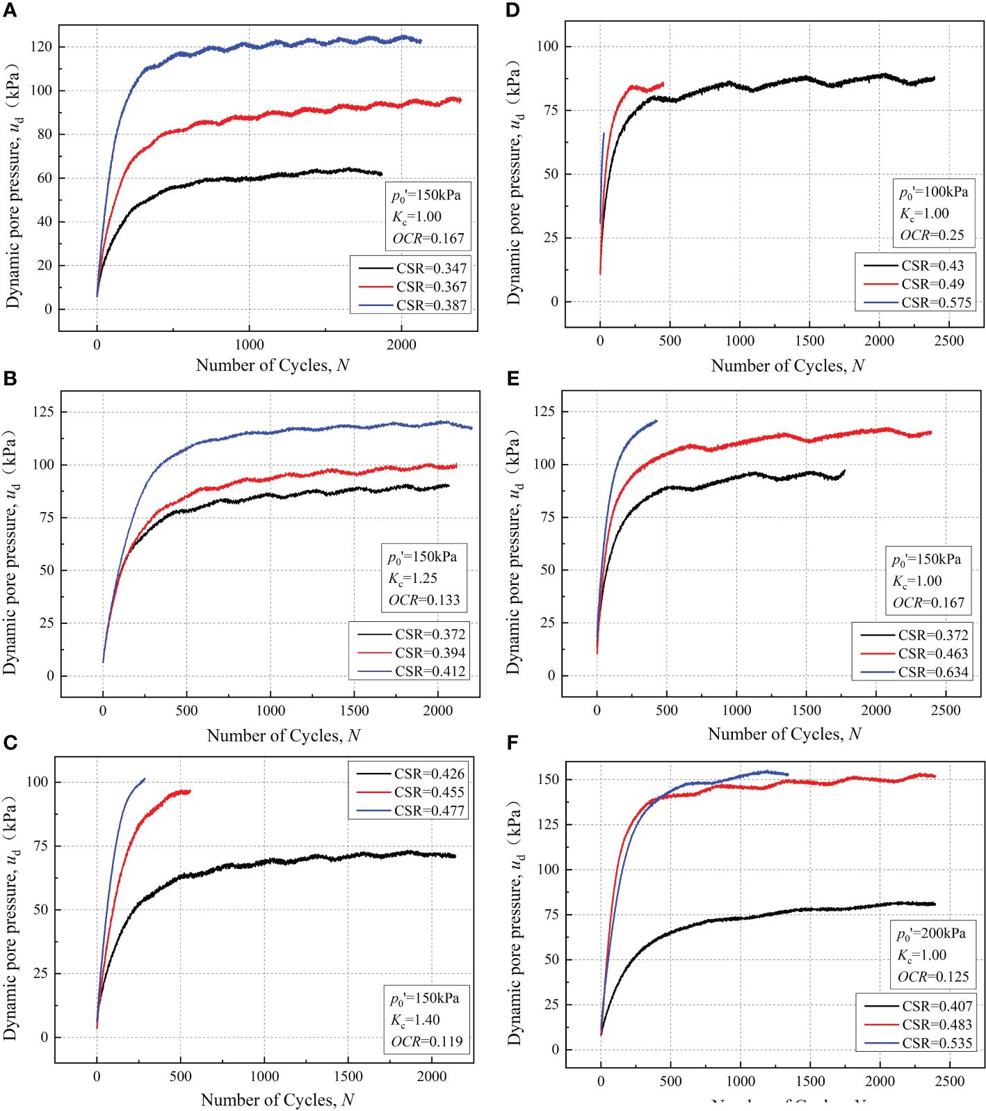 Accumulations of the dynamic pore water pressure under different stress magnitudes [(A–C) Station-1 under different Kc (Nian et al., 2018); D–F Station-2 under different OCRs (Nian et al., 2020)].