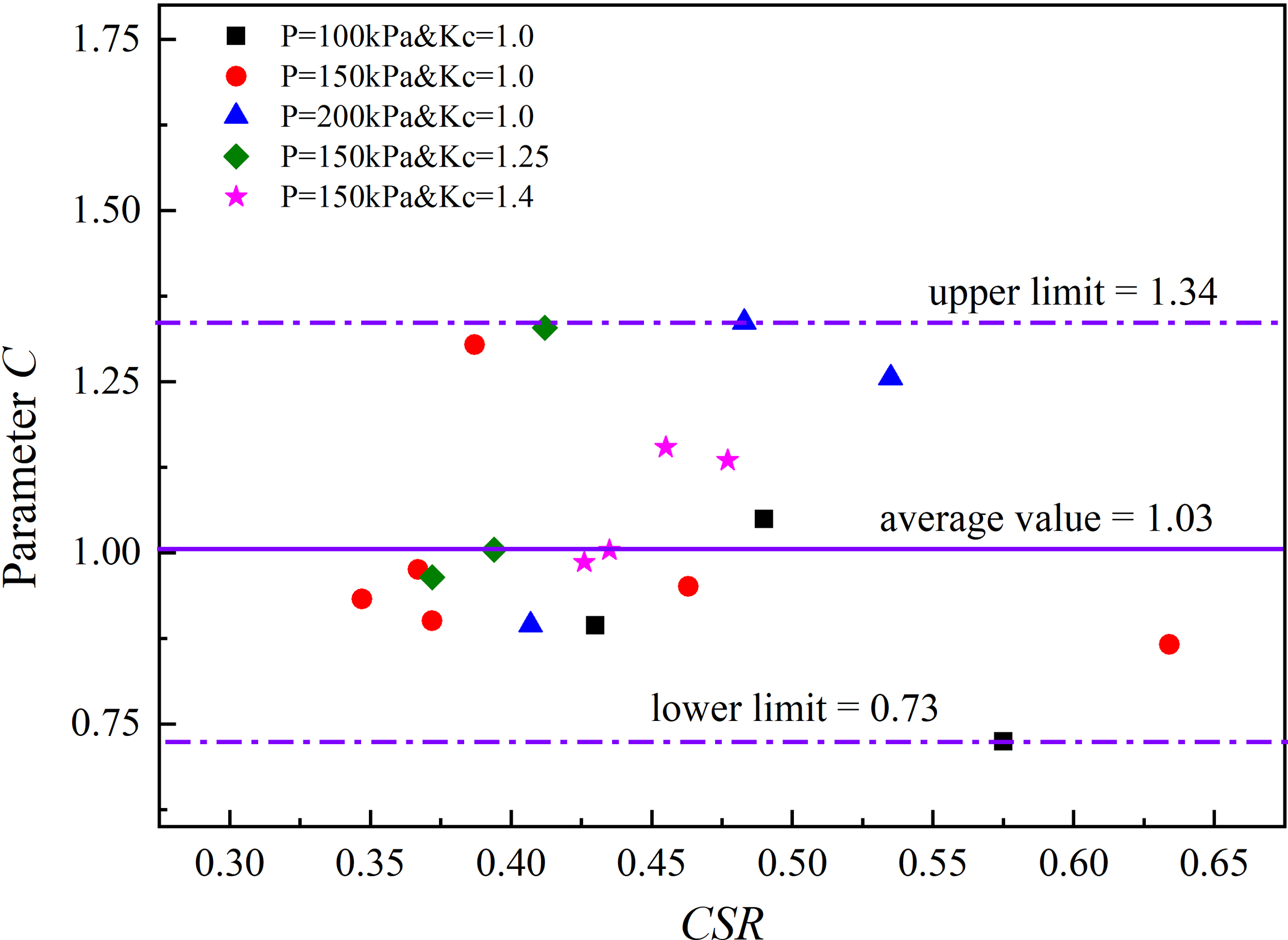 The relationship between the dynamic pore pressure and dynamic strain suggests that the factors governing strain also play a crucial role in determining the pore pressure. These factors include cyclic stress, effective confining pressure, and clay static strength. The model parameters are designed to capture the influence of these factors on the dynamic pore pressure. Ren et al. (2018) emphasized that the exponential parameter C characterizes the rate of pore pressure development, specifically how fast it increases with loading cycles. Importantly, C does not influence the generation of permanent pore pressure. On the other hand, the physical meaning of parameter c in the strain model has consistently maintained its interpretation. This implies that parameter C may solely depend on the inherent physical properties of the clay and should be independent of the stress state. This distinction clarifies the roles of C and c, reinforcing the model’s ability to capture the nuanced behavior of pore pressure under dynamic loading conditions.