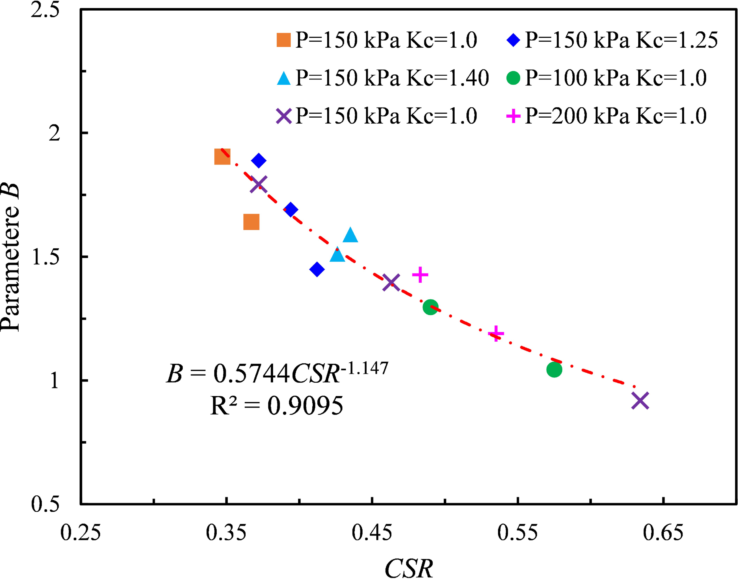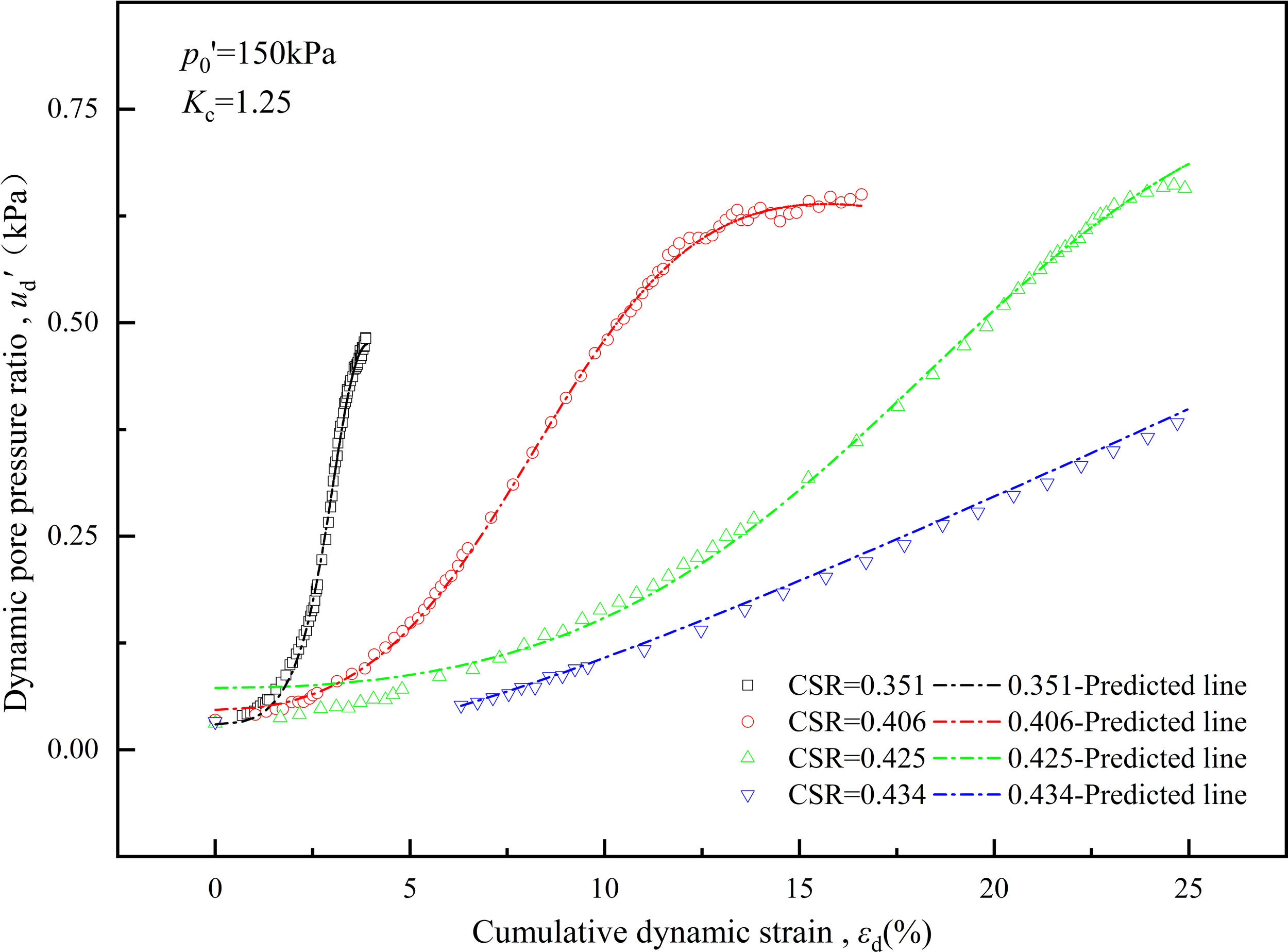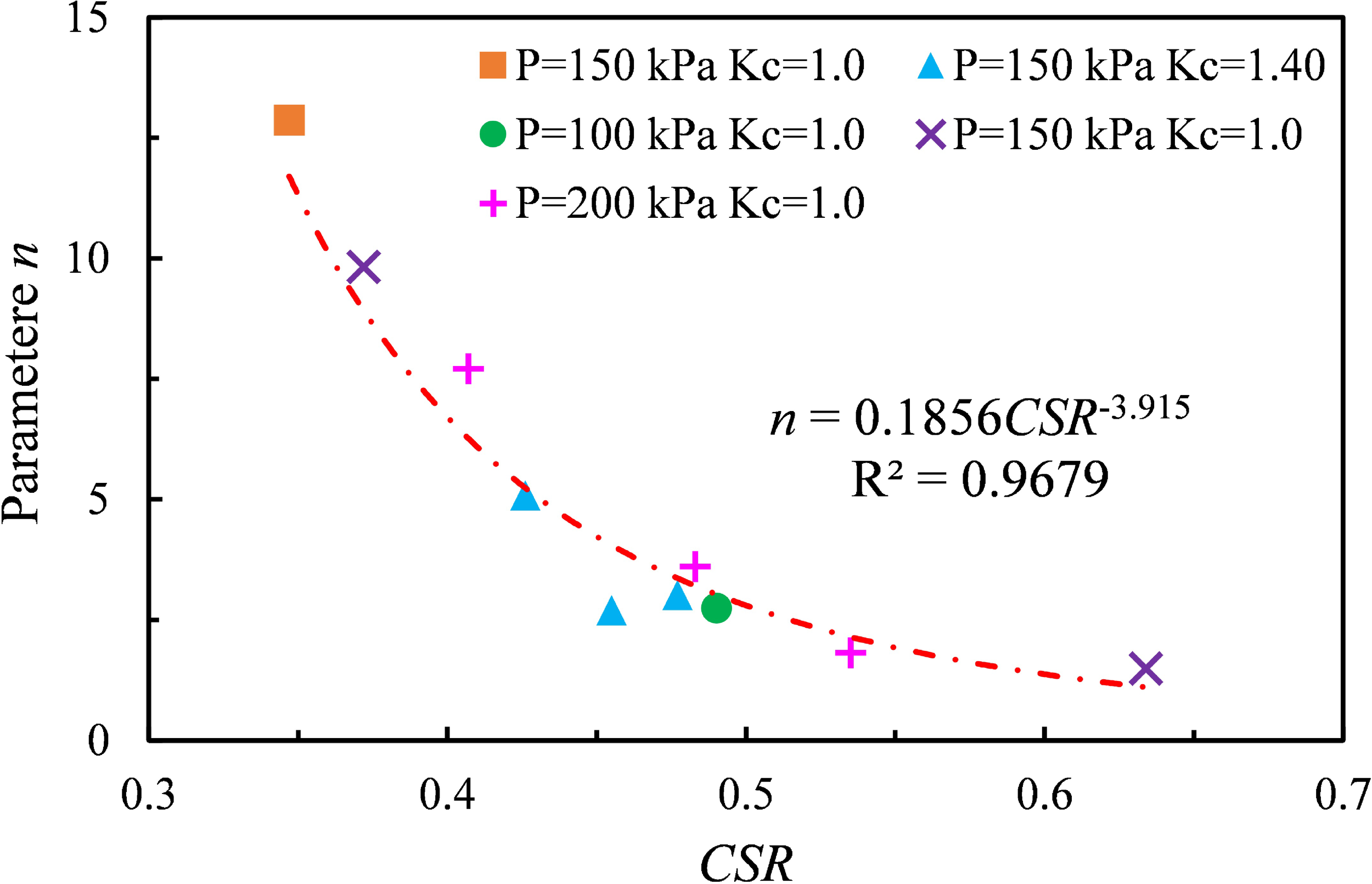 Through fitting and analyzing the dynamic strain data, it is observed that the model (Equation (2)) based on the well-known classical Hardin-Drnevich model (Hardin and Drnevich, 1972) effectively captures the cumulative plastic deformation of deep-sea soft clay caused by dynamic stress: