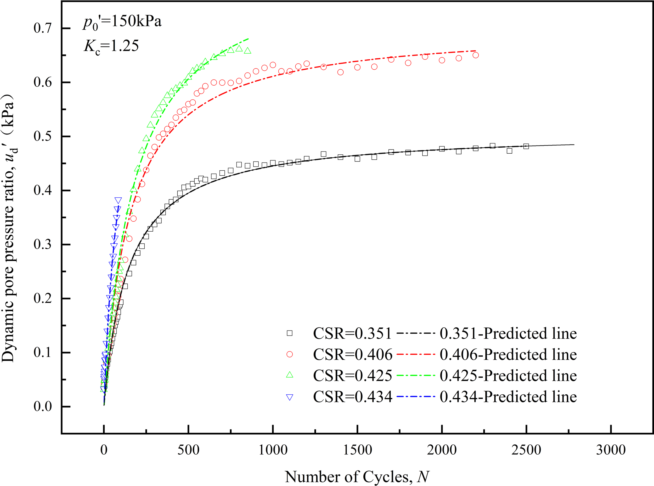 where ud’ is the dynamic pore pressure ratio; ud is the dynamic pore pressure; P0’ is the initial mean effective stress; and A, B, C, and D are parameters that depend on the stress state and physical properties of the clay.