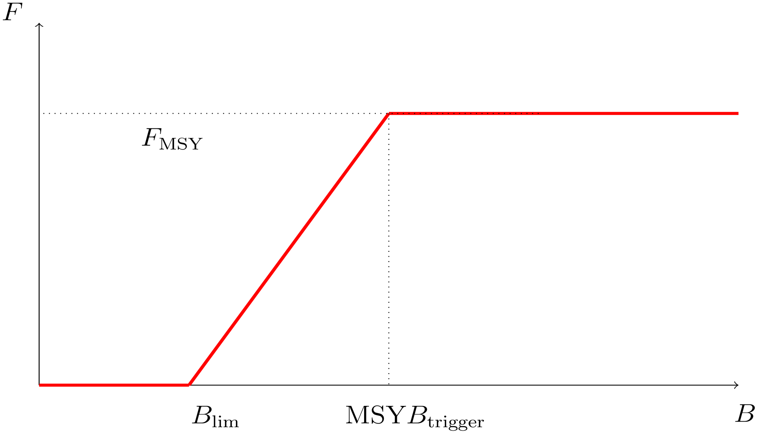 A “protective” HCR based on biomass thresholds Blim and Btrigger with MSY as the target (Mackinson et al., 2018, Figure 4B).