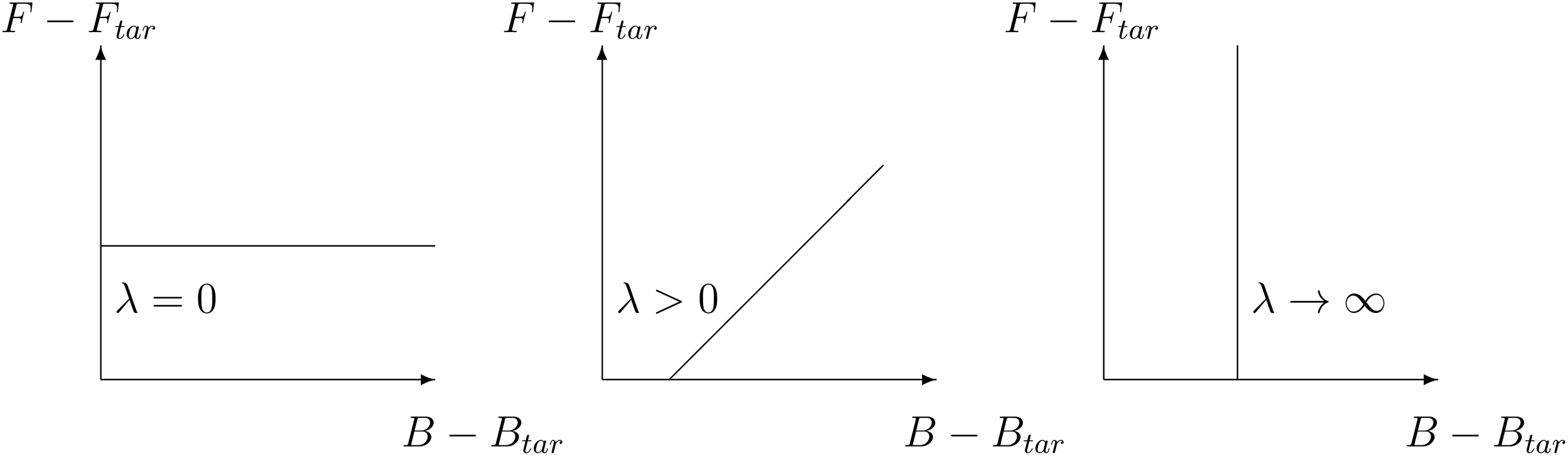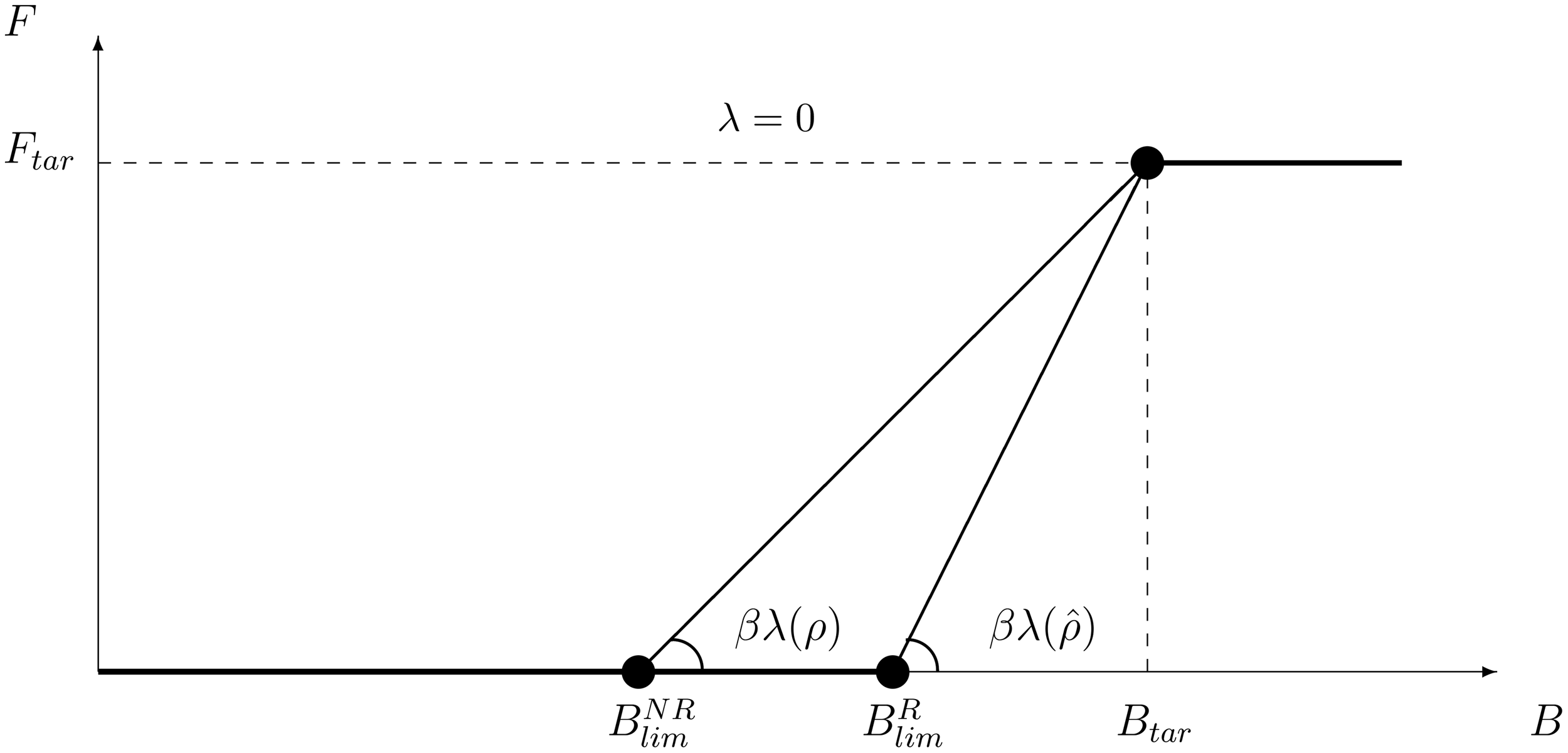 An HCR can be understood as the result of minimizing the loss function (3), taking into account the population model. This interpretation means that an HCR is characterized by the parameter λ. Note that with λ = 0 the rule is independent of the biomass, and the instrument is constant over different biomass levels. With λ approaching infinity, the rule is (equivalently) linear in the biomass level, and a bang-bang or most rapid approach path solution emerges. A positive, finite lambda dictates a trade-off between fishing mortality and biomass and may be associated with a positive . Figure 3 illustrates these cases, which shows are somewhat reminiscent of classical thinking as embodied by (Hilborn and Walters, 1992, Chapter 15).