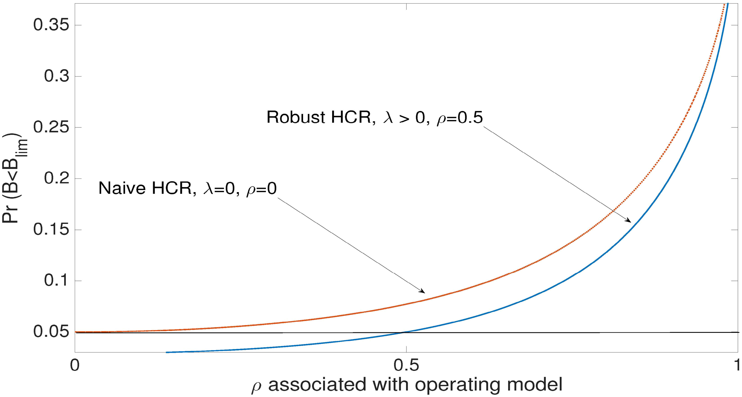 Figure 4 shows how naive HCR performance deteriorates more quickly than robust HCR rules as scientific uncertainty (the correlation generated by the perturbation process, ) increases. When the naive constant effort rule, , is applied the precautionary constraint is violated, i.e.