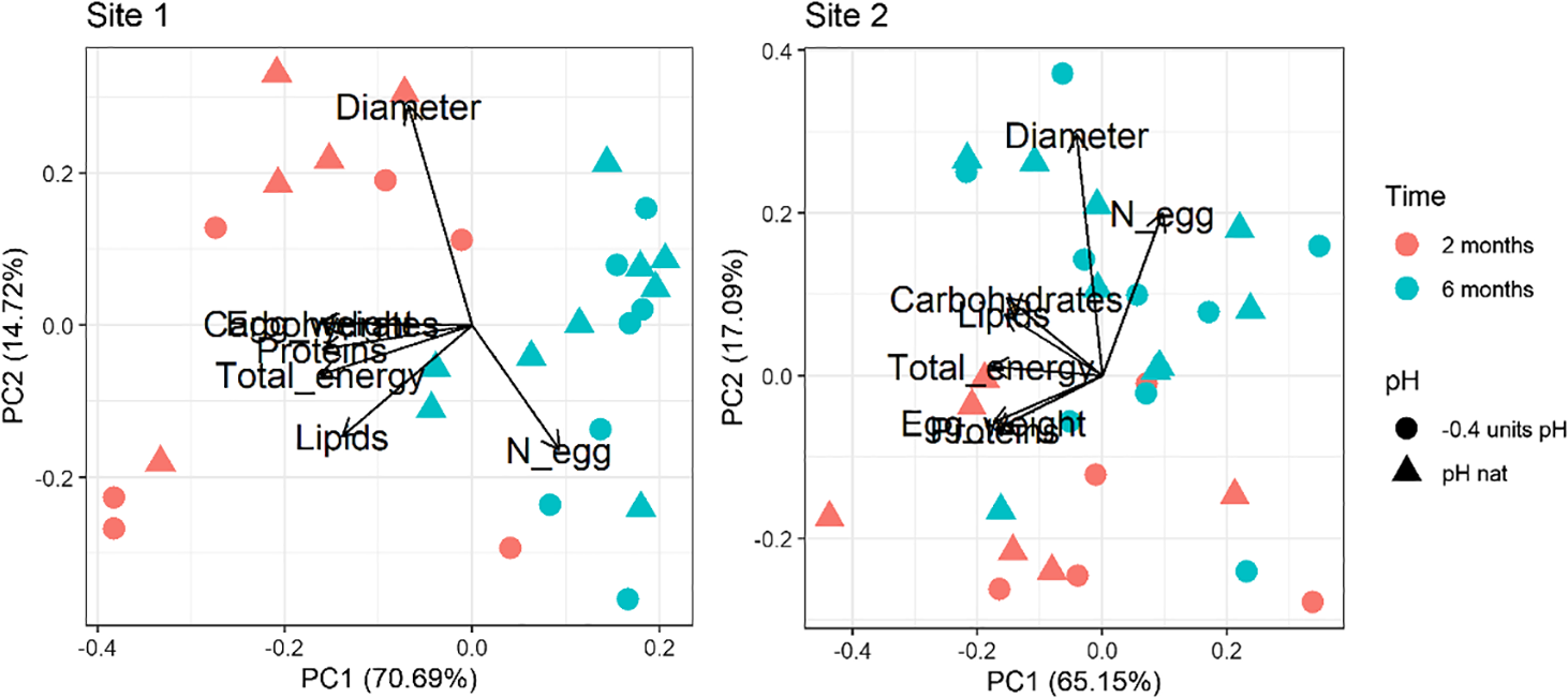 For both Site 1 and Site2, the results of the Principal Component analysis performed on the multiple egg quality variables are shown in Figure 1. Loadings values are reported in Supplementary Table 3 in Supplementary Material. The first (PC1) and second (PC2) principal components explained over 85% and 82% of the variance for Site 1 and Site 2, respectively. A clear separation between times of exposure is revealed in both biplots. The first principal component (PC1; 70.69% of the overall variance explained for Site 1 and 65.15% for Site 2) is associated with the egg weight, the biochemical composition and the total energy content, while the second (PC2; 14.72% of the overall variance explained for Site 1 and 17.09% for Site 2) is mainly associated with the number of spawned eggs and their diameter. The time-dependent separation regards PC1 for the Site 1 animals and PC2 for the Site 2 ones. A separation between pH conditions is not evident.