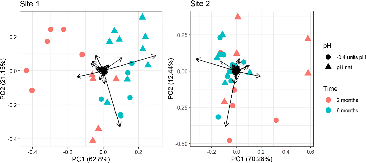 The PERMANOVA analysis highlighted the same pattern with significant differences between time points considered (two and six months), for both Site 1 and Site 2 sea urchins (Table 2). Egg quality was not significantly affected by pH of exposure or the interaction between pH and time of exposure.