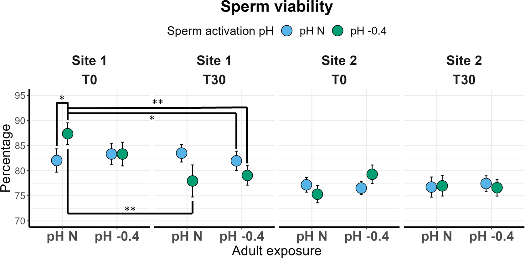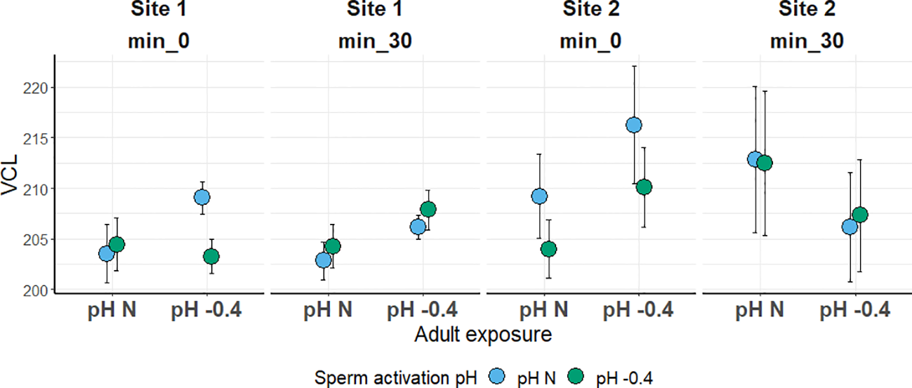 Sperm viability and velocity were tested right after collection (see Section 2.4) in sperm from males from the two sites (Site 1 or Site 2) reared for six months at the two conditions (natural pH or -0.4 pH) (“pH of adult exposure”). For each male, sperm were analyzed after activation with ASW at both natural and acidified pH (“pH of sperm activation”). Each sample was analyzed at two time-points after sperm activation: immediately after activation (T0) and 30 minutes later (T30) (“time post-activation”). Measures were repeated twice at each time point to estimate repeatability within samples.