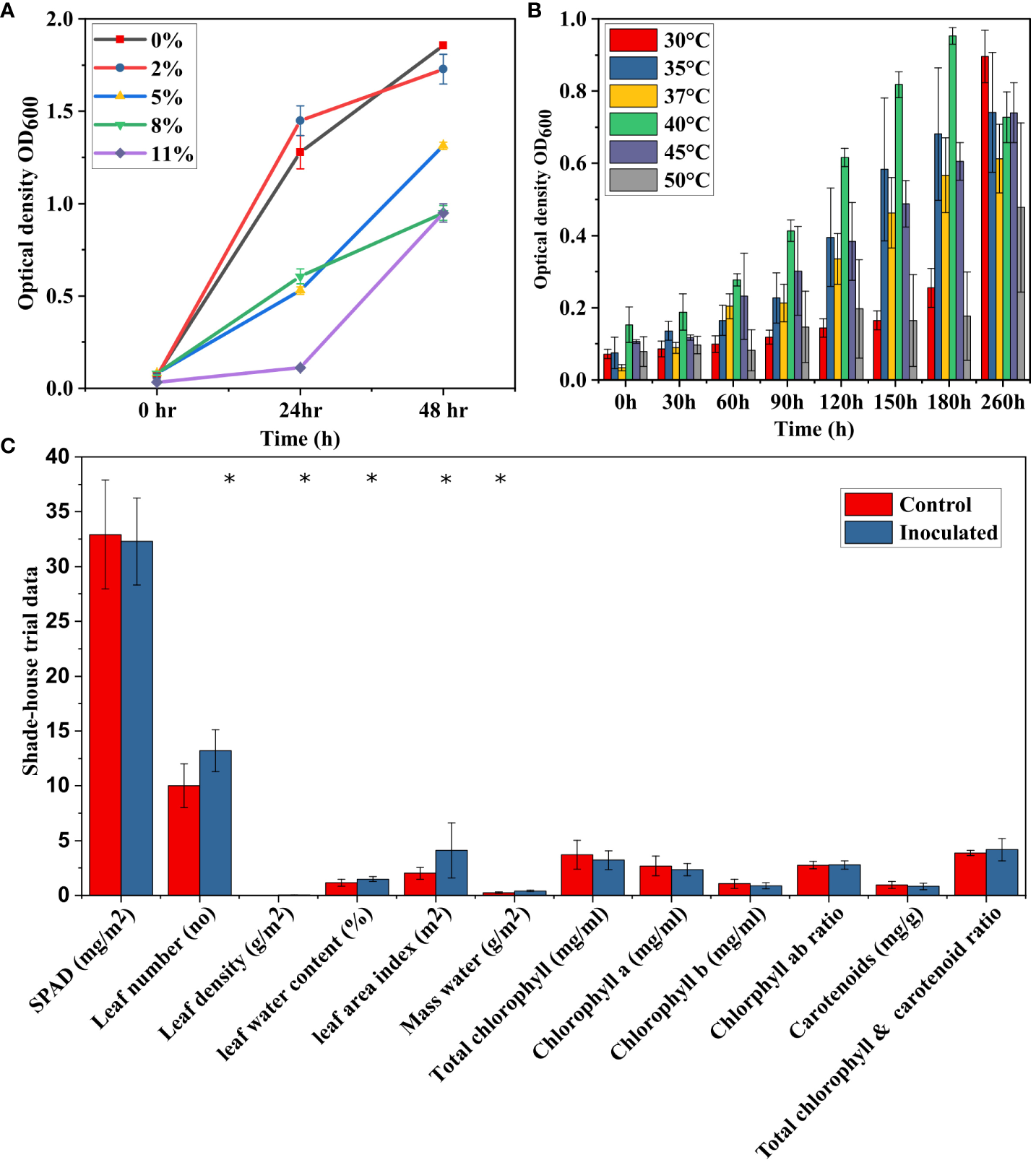 The ability of Bacillus sp. SW7 strains to tolerate salinity ranging from 0-11% NaCl (A) and their heat stress tolerance, showing growth up to 50°C (B). (C) Effect of Bacillus sp. SW7 inoculation on tomato plant growth parameters. The experiment consisted of 5 trials, each performed in triplicate, and data were analyzed using Student’s t-test. Shade-house evaluation of Bacillus sp. SW7 inoculation on various growth parameters in tomato plants, with * indicating significant differences.
