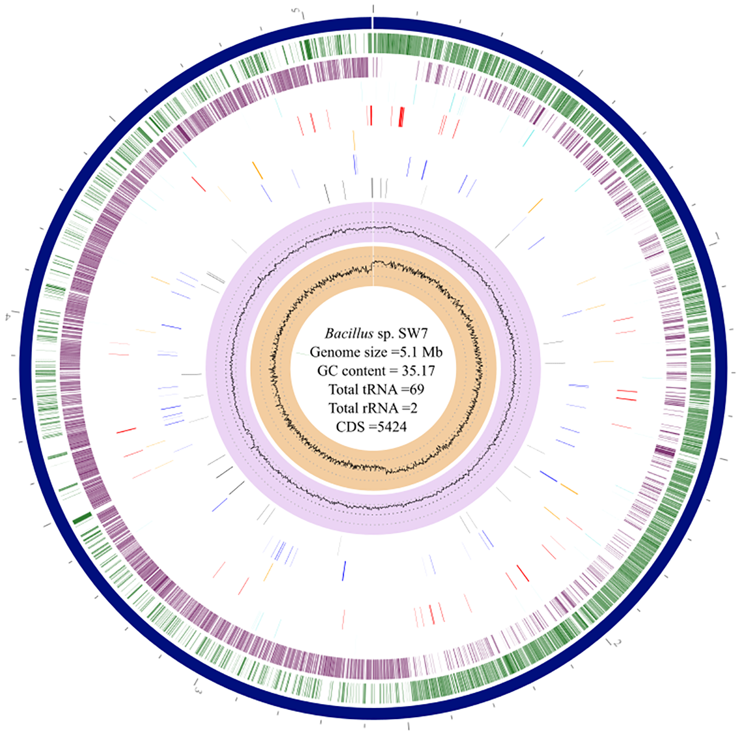 The assembled genome of strain SW7 comprises a circular genome of 5,155,809 bp with G+C content of 35.17% (Figure 2). In total, the genome consists of 5,424 predicted protein-coding sequences (CDSs), 02 rRNA, and 69 tRNA genes. The assembled genome has a completeness of 98.56% with zero percent contamination. Approximately, 4,104 protein-coding genes were predicted to be functional, and 1,320 hypothetical proteins. Among the predicted CDSs, around 3,736 CDSs (68.88%) were assigned to the Clusters of Orthologous Groups (COG) database. For more details on COG categories, KEGG pathways, Enzymatic (Reactions) Commission numbers (EC) and GO terms assigned to the strain SW7 (refer Supplementary Results S1, Supplementary Figure S2).
