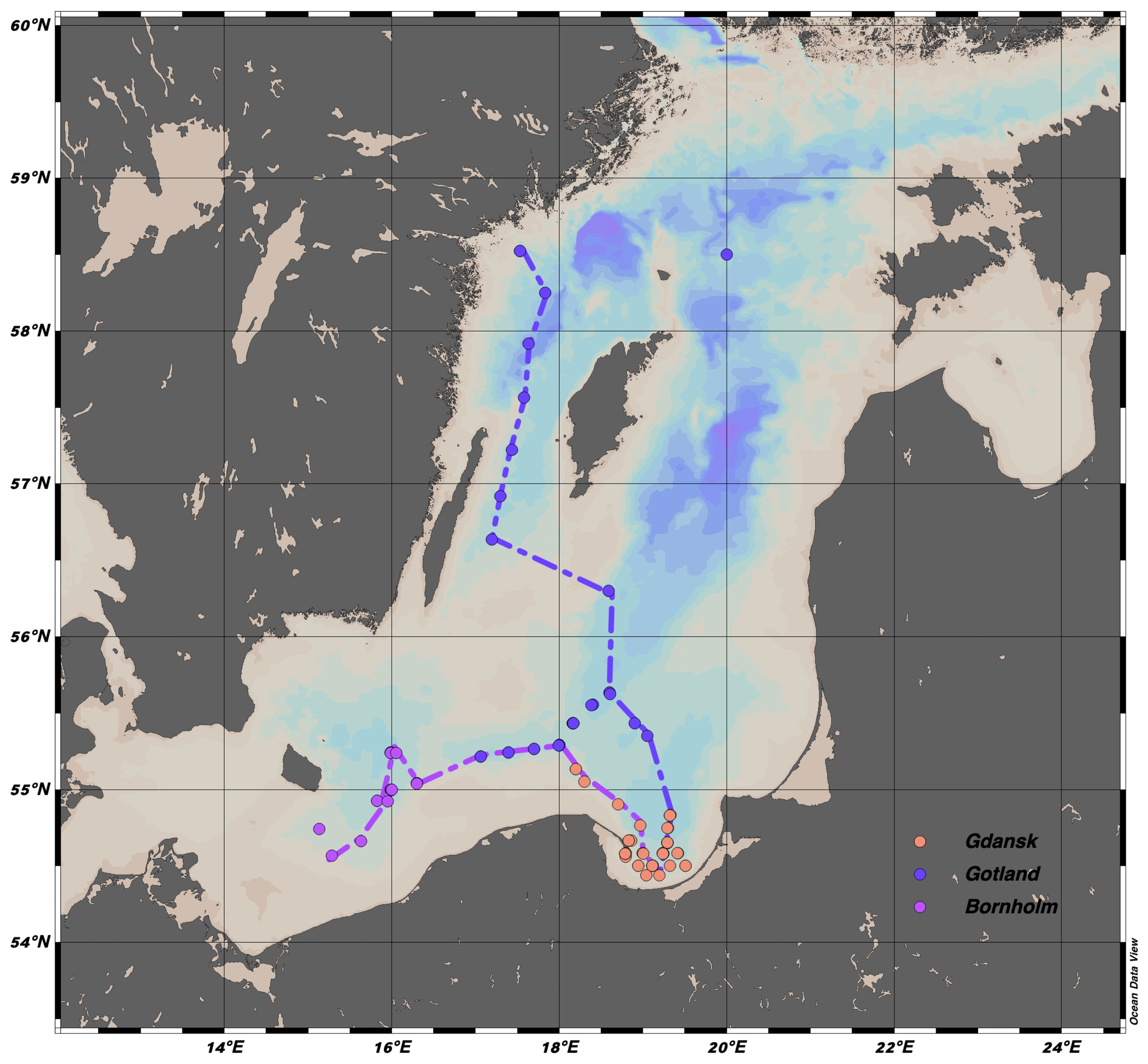 Spatial distribution of measured profiles in three different regions: Bornholm, Gulf of Gdańsk, and Gotland. The colored dashed-dotted lines show the trajectories used to build the section plots.