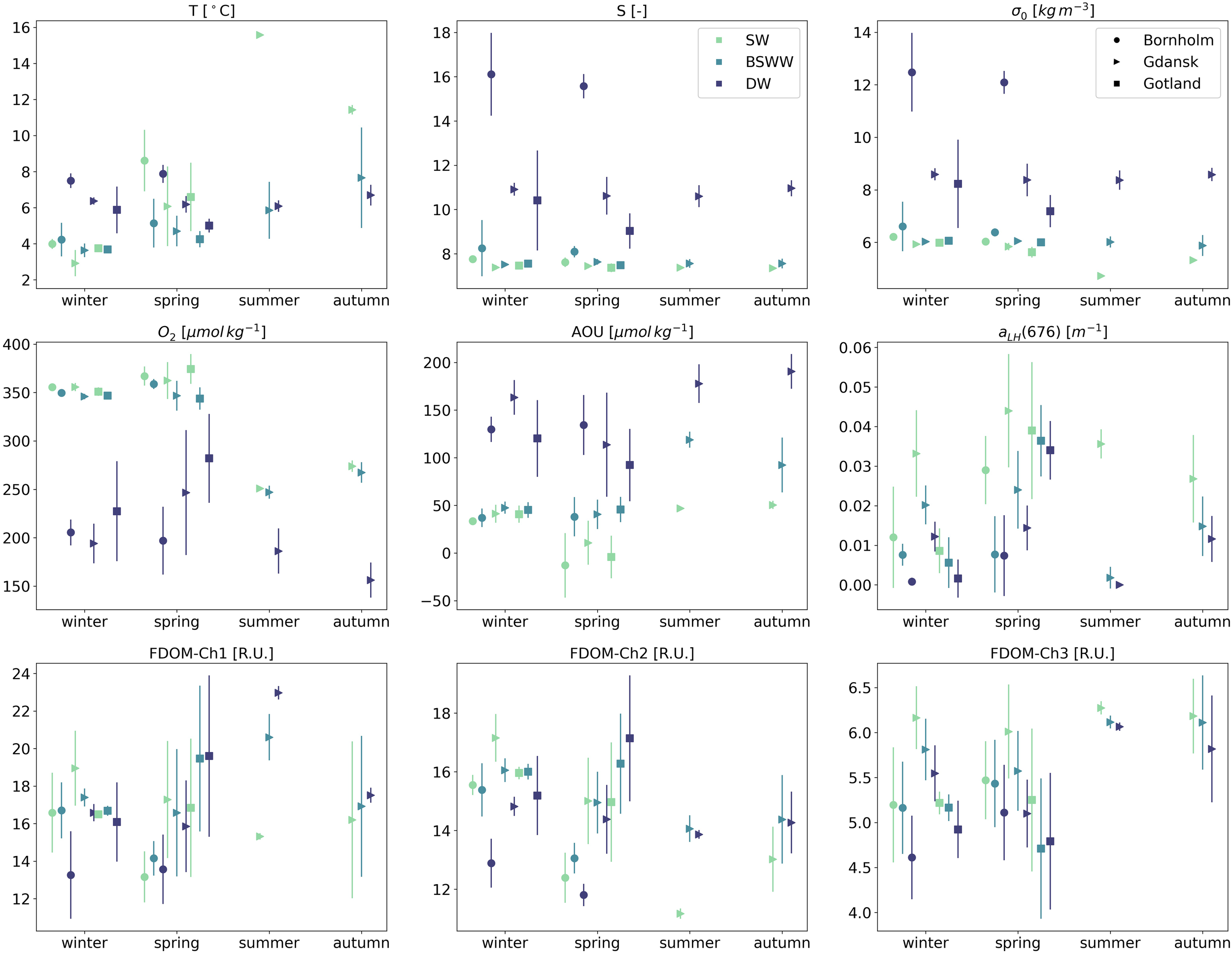 Seasonal median values and interquartile ranges of thermohaline, biochemical, and optical properties for three water masses (SW, BSWW, and DW - different colors) and three different regions: Bornholm, Gulf of Gdańsk and Gotland (different markers).
