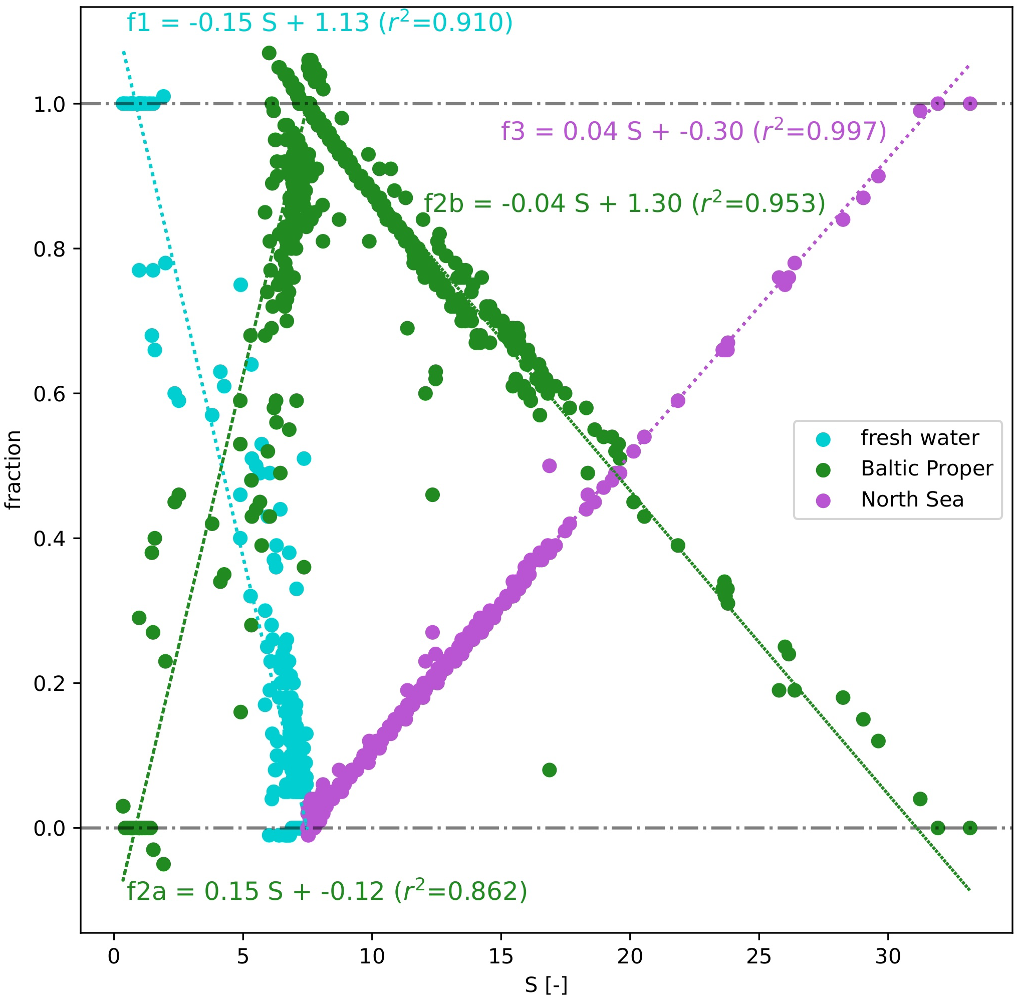 Based on the results of the three end-member mixing models from the testing data subset (N=1194), a high correlation was observed between the calculated fractions fi and S for three different water masses, Figure 4. The Baltic Proper was split into two regimes, i.e., for S<7.5 and equal or greater than 7.5 (f2a and f2b), representing mixing of freshwater with the Baltic Proper (regression lines f1 and f2a) and of the Baltic Proper with the North Sea (regression lines f2b and f3). The coefficient of determination (r2) was lowest for the Baltic Proper at S<7.5 (f2a, r2 = 0.862) and highest for the North Sea end member (f3, r2 = 0.997). This demonstrates a very strong relationship between S and modeled fractions from the mixing model and can further serve as a solid basis to estimate water fractions per point based on S values for the entire data set.