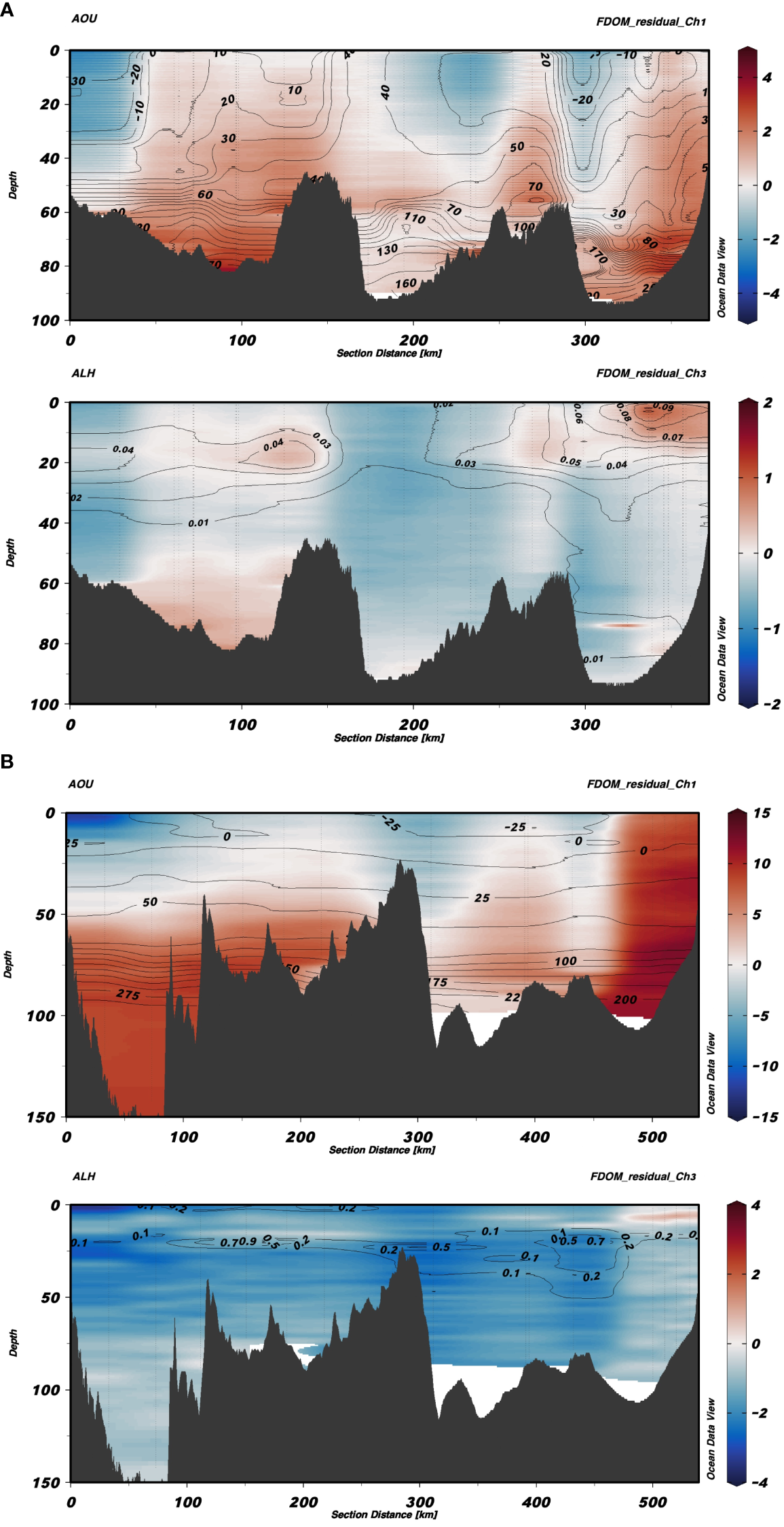 Section plots from Bornholm to the Gulf of Gdańsk (A) and from Gotland to the Gulf of Gdańsk (B). In each of the images, the top figure shows FDOM-Ch1 residuals with contour lines of AOU, whereas the bottom figure shows residuals for FDOM-Ch3 with contour lines of aLH(676).