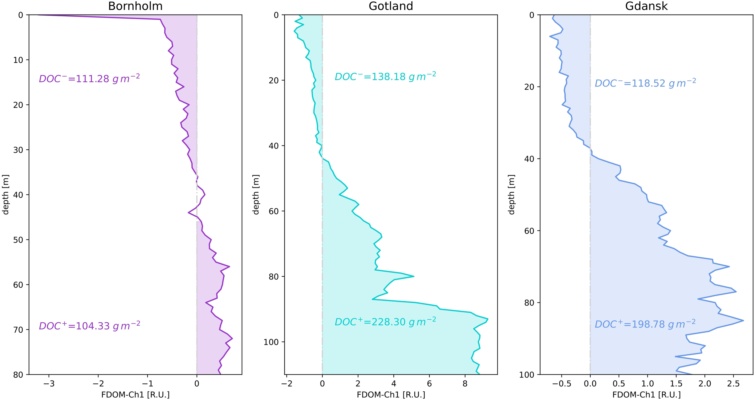 The extensive data set and its spatio-temporal variability allowed us to propose a more generalized concept of the dissolved organic matter cycle, conveying that the most important process determining the removal of humic-like organic matter is photobleaching. Bacterial recycling of the protein-like fraction by aerobic prokaryotes is more efficient compared to humic-like fractions, as evidenced by the greater accumulation of FDOM-Ch1 and removal of FDOM-Ch3. The bottom FDOM signal can be reduced in two ways: by dilution and oxidation with water flowing from the North Sea, which is supported by the strong spatial gradient between Bornholm (low FDOM-Ch1 residuals and low AOU) and Gotland (higher FDOM-Ch1 and high AOU) deep waters. This was further corroborated by the SUVA254 signal, which is a proxy for aromaticity. Following the large inflow of saline water in winter 2014, aromaticity values decreased, suggesting a change in molecular structure due to partial DOC oxidation. Vertically integrated values of DOC were obtained to infer the net accumulation and removal areas from the FDOM-Ch1 residuals. The Gotland Basin appears to be the region with the highest DOC accumulation and acting as a carbon source, followed by Gdańsk and Bornholm. Bornholm is also the basin with the highest DOC removal, closely matched with Gotland. The lowest DOC removal was calculated for the Gulf of Gdańsk, which can be explained by the constant inflow of DOC from riverine discharges.