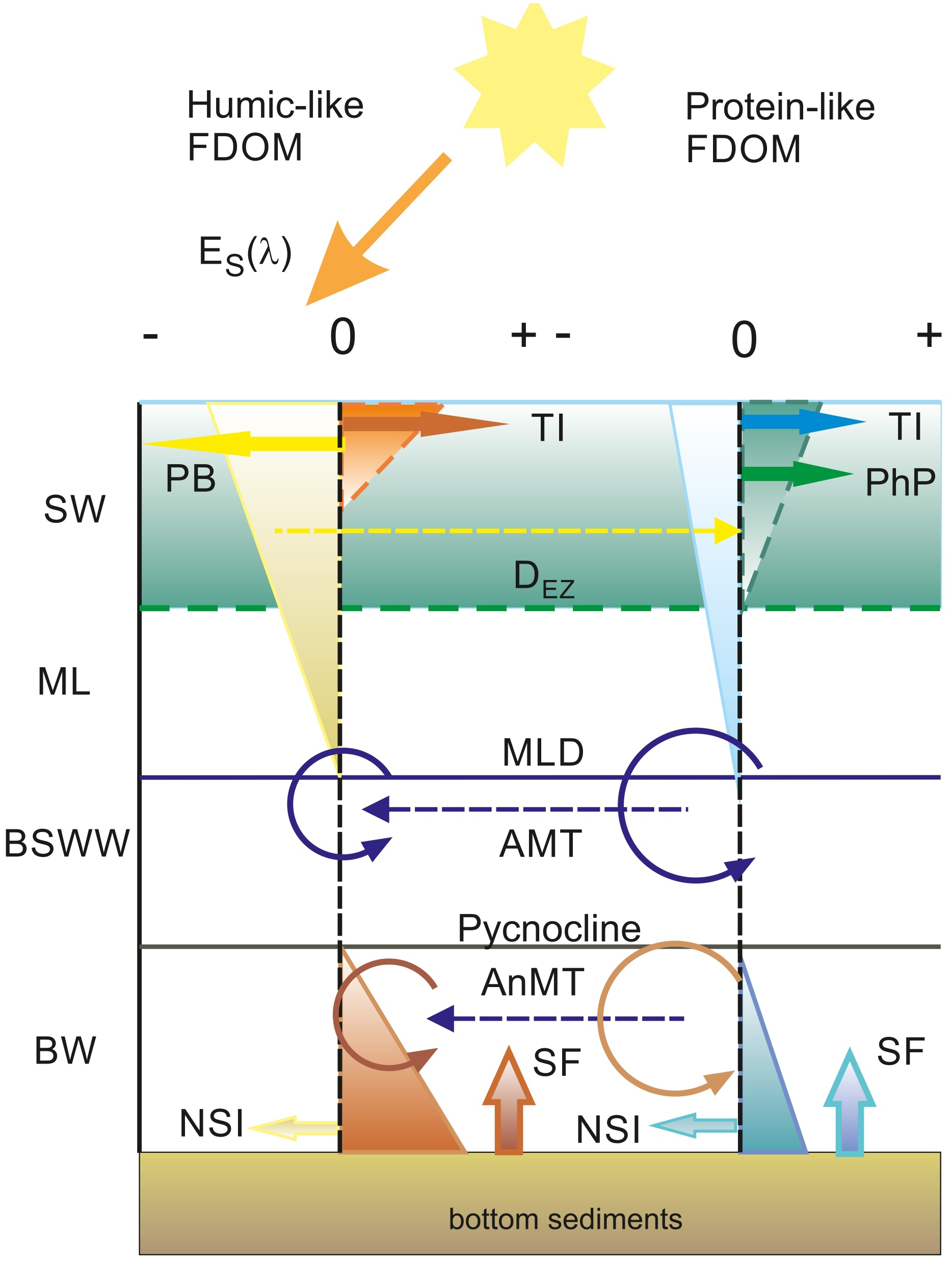 Schematic of DOM accumulation and decomposition zones in the Baltic Sea and contributing processes. The dashed vertical line marking 0 residual values for humic-like and protein-like FDOM fractions denotes the equilibrium between decomposition (negative residual values) and accumulation processes (positive residual values). Surface water (SW) is the layer where there is measurable phytoplankton production (PhP) limited by the euphotic depth (DEZ). The seasonal thermocline maximum limit is constrained by the mixed layer depth (MLD). Below the MLD and above the permanent pycnocline, there is a layer of Baltic Sea Winter Water (BSWW). Below the pycnocline, there is the deoxygenated bottom water (BW). Vectors illustrate processes – negative for decomposition: photobleaching (PB) and North Sea Inflow (NSI). Accumulation processes are illustrated by positive vectors: terrestrial inflow (TI), phytoplankton production (PhP), and sediment flux (SF). Recirculation of DOM through aerobic microbial transformation (AMT), and anaerobic microbial transformation (AnMT), illustrated by a circular dash and dashed vectors, mark presumed pathways of material flow between humic-like and protein-like FDOM fractions.
