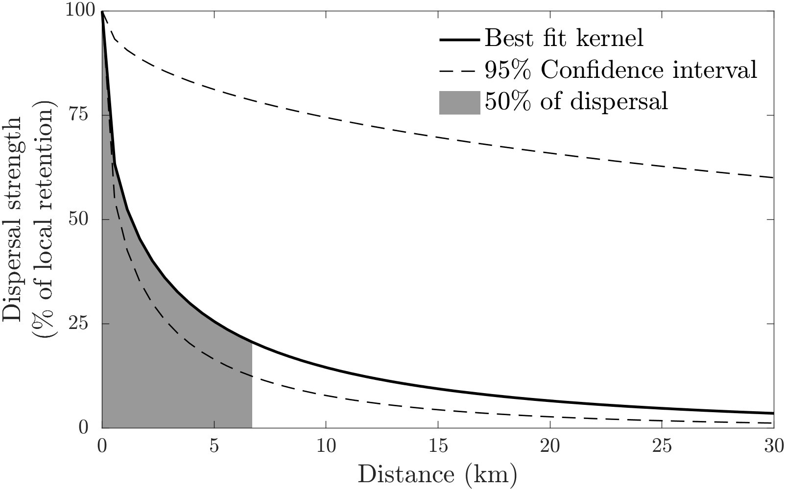 with . The fit implies that the mean dispersal distance in the system was 15 km, and that half of the larvae are settling within 6.7 km of their natal population. The kernel predicts that the overwhelming majority of settlement (95%) happens within 59 km of the larval source. The Cauchy kernel is particularly steep at the origin (Figure 2), suggesting that the strength of dispersal drops off very rapidly with distance.