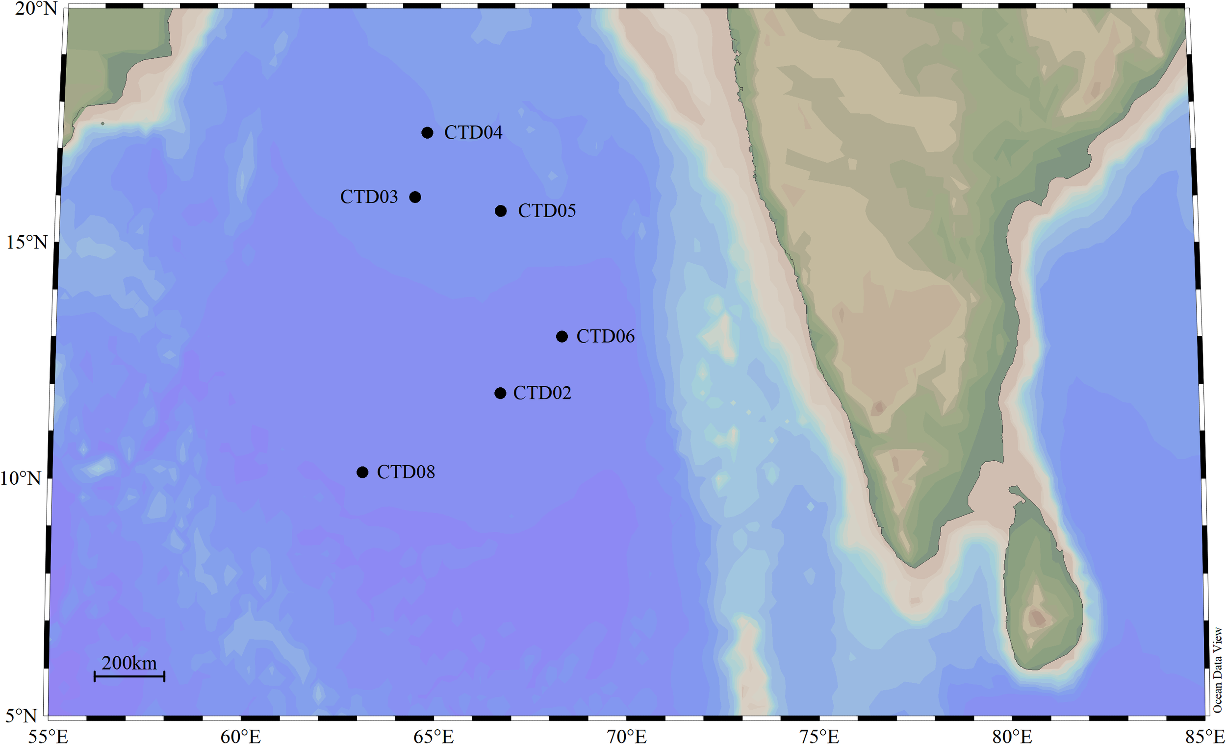 Seawater samples were collected from 6 stations located the Arabian Sea of northern Indian Ocean during China DY72 cruise onboard the Research Vessel Shen Hai Yi Hao. These stations (Latitude: 10.132553°N-17.326766°N, Longitude: 63.103385°E-68.303971°E, water depth: 3550m-4458m) was sampled from 17th May 2022 to 28th May 2022 (Spring intermonsoon), spanning the north to the south of Arabian Sea. Stations of CTD03, CTD04 and CTD05 located in the northern AS were defined as the core OMZ in AS. Stations CTD02 and CTD06 located in the middle of AS were defined as OMZ transition zones, while CTD08 in the southern AS as a non-hypoxia zone. For most stations, the sampling depths included deep chlorophyll maximum (DCM), oxygen minimum zone (OMZ), 1000 m, 2000 m, and the bottom. In total, 44 samples from 6 stations were collected from AS. These samples were divided into 4 groups based on DO and depth, including euphotic zones (AS_UP), OMZ (AS_OMZ), bathypelagic zone (AS_DOWN) and CK (CTD08). DO levels below 20 μM are defined as the AS_OMZ group. Although the DO values of CTD03-100 was 22.1188 µM, but CTD03-100 was still categorized to AS_OMZ group. DO level higher than 20 μM and depth over or equal to 100m is defined as the AS_UP group. Depth below or equal to 1000m is defined as the AS_DOWN group. The detailed information of sampling sites and depths were provided in Figure 1 and Supplementary Table 1.