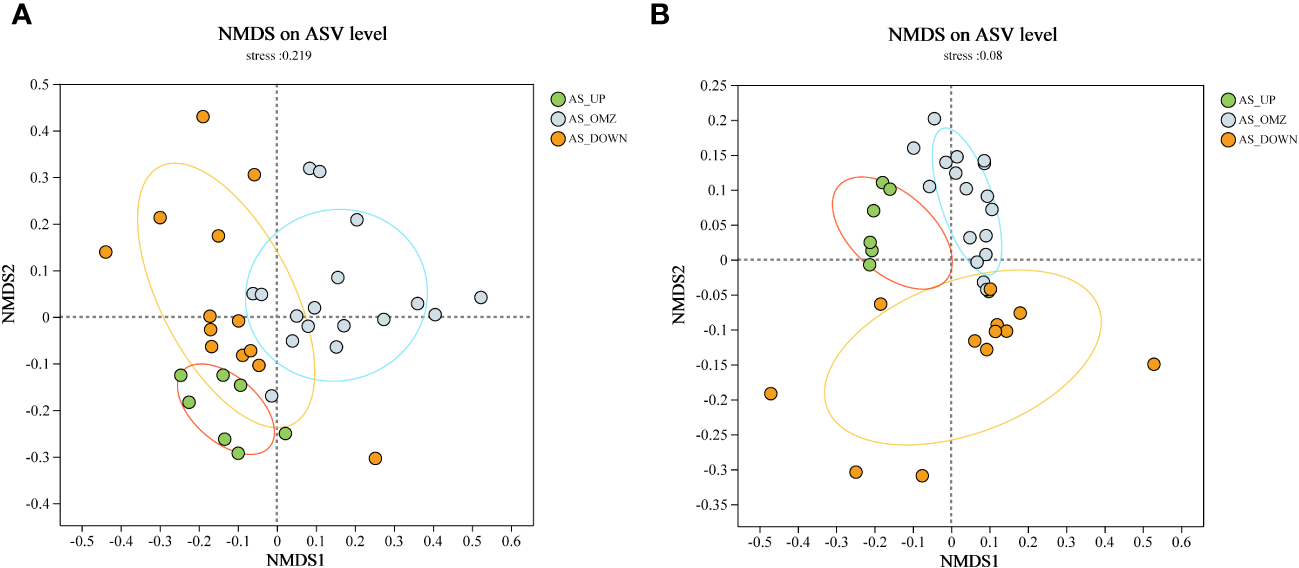 NMDS plot based on Bray-Curtis distance among AS_UP, AS_OMZ and AS_DOWN communities. (A) bacterial communities at ASV level (B) archaeal communities at ASV level.