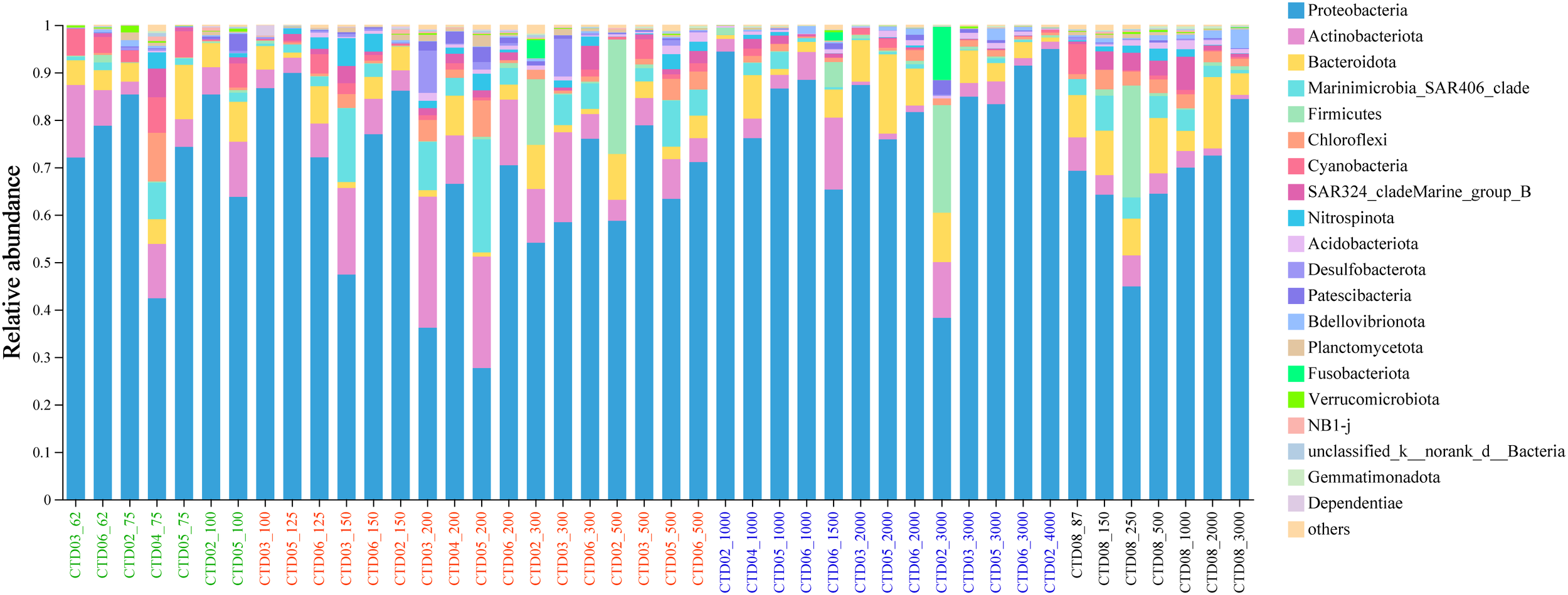 Analysis of the bacterial community composition of the 44 samples revealed that Proteobacteria, Actinobacteriota, Bacteroidota, SAR406, Firmicutes, Chloreflexi, Cyanobacteria, SAR324, Nitrospinota were dominant phyla across nearly all samples, although their relative abundance varied among different samples. Proteobacteria (accounting for 27.67%-94.94%) was the most dominant phylum across all samples followed by Actinobacteriota (0.69%-27.64%), Bacteroidota (0.89%-16.69%), Cyanobacteria (0.1%-7.48%), and Marinimicrobia_SAR406 (0%-23.84%) in AS (Figure 3).