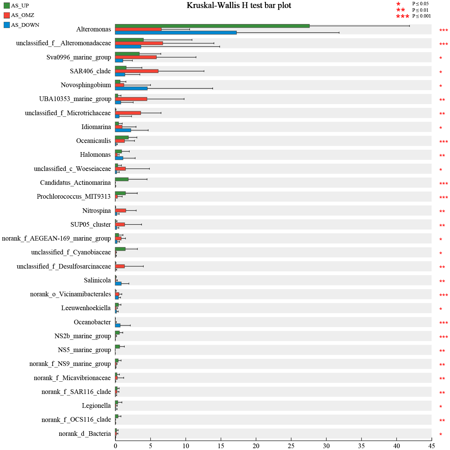 The 30 bioindicator taxa that significantly differentiate AS_UP, AS_OMZ and AS_DOWN communities in AS. *: P ≤ 0.05, **:P ≤ 0.01, ***:P ≤ 0.001.