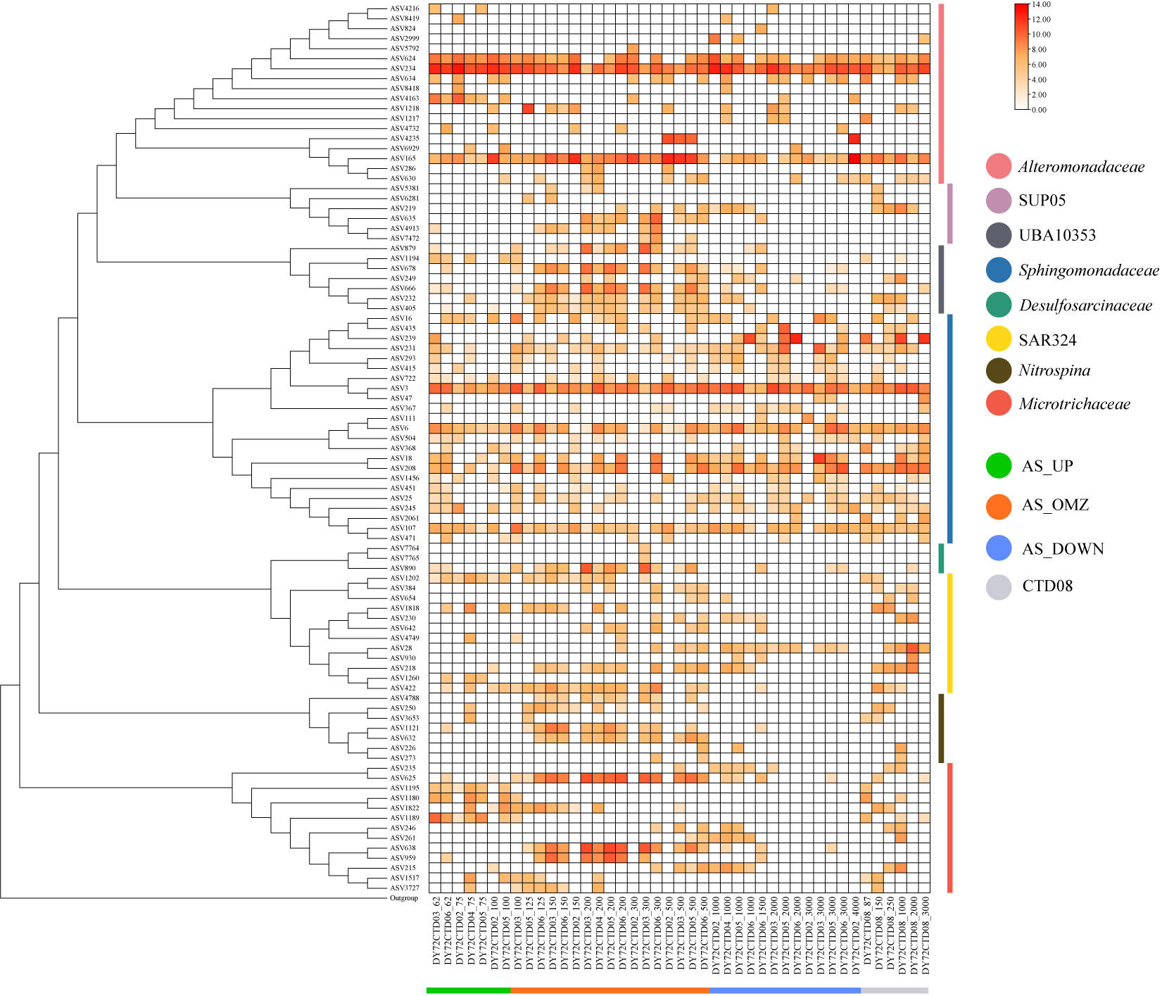 At the genus level, the top 10 abundant genera with high relative abundance included Alteromonas, Acinetobacter, unclassified_f:Alteromonadaceae, Thalassospira, Oleibacter, Sphingobium, Sva0996_marine_group, SAR406_clade, Erythrobacter and Marinobacter (Figure 4). Alteromonas dominated in most of the samples in AS-UP. Acinetobacter and Thalassospira were mainly distributed in OMZ and deep layer in AS. Interestingly, Oleibacter showed high abundance in two samples (CTD05_125m, CTD06_1000m). Sva0996_marine_group, belonging to Acidimicrobiia class, increased relative abundance in AS OMZ layer (Figure 4). Other predominant genus such as Sphingobium, Erythrobacter and Marinobacter showed no significant differences among the three genus in these groups.